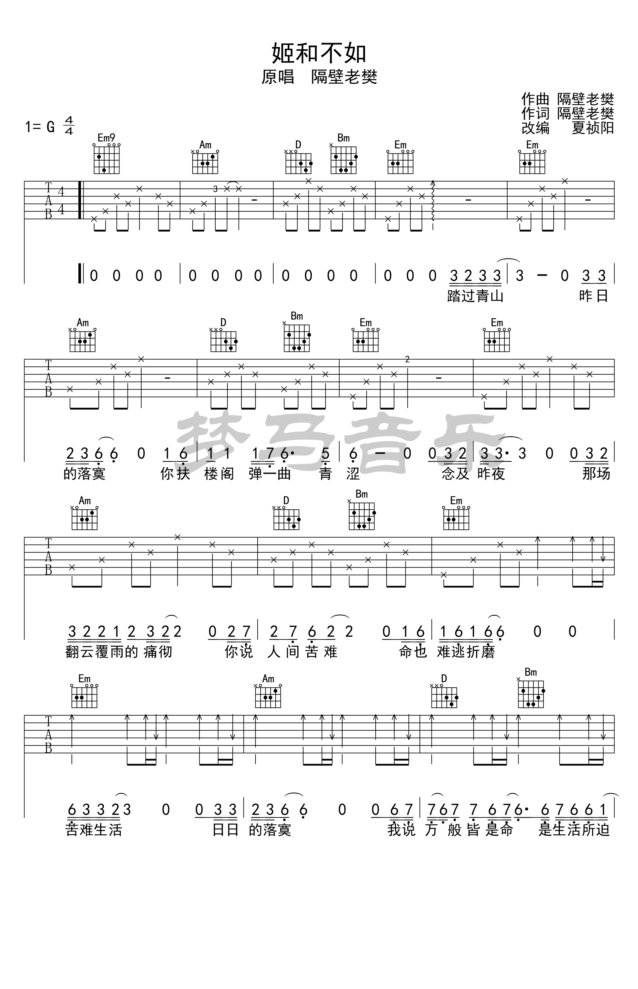 《妓和不如》是一首由隔壁老樊创作的民谣歌曲,现提供了妓和不如的吉他G调六线谱,梦马音乐编配。三张高清图片谱为弹唱提供清晰指导。在感谢梦马音乐的同时,附上了吉他弹唱视频,以便更好地学习。这首歌曲经过谢老师的精彩演绎,进行了较大幅度的改编,展现了独特的音乐风格。通
