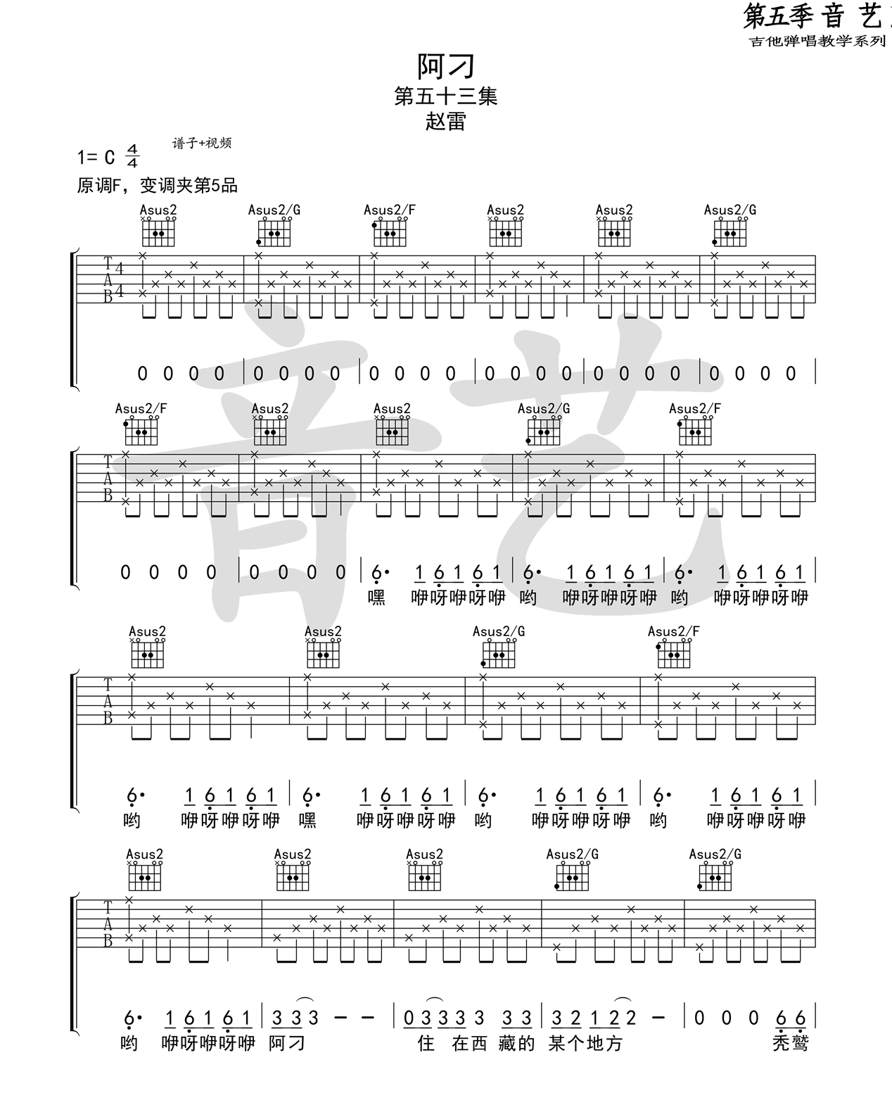 这是一首鼓舞人心的歌曲谱,是赵雷的《阿刁》吉他谱,原调F,变调夹夹五品,选用C调指法。这份阿刁吉他弹唱谱包含了六线谱的高清版本,以五张图片谱的形式呈现,跨越两页。赵雷的歌声充满了生活的哲理,不仅在面对困境时传达希望,也在幸福时呼唤感恩之情。这首《阿刁》平凡而坚