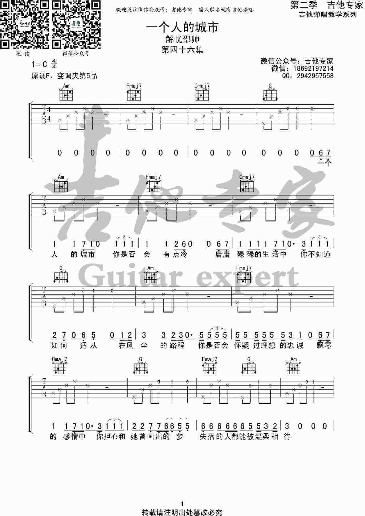 《邵帅《一个人的城市吉他谱》(C调)》内容来自于互联网,不能保证内容的准确性与完整性,仅供学习交流欣赏,请勿用于其它用途,内容版权归原作者及来源网站所有,如有侵犯到您的权益请来信告知,我们将及时删除。