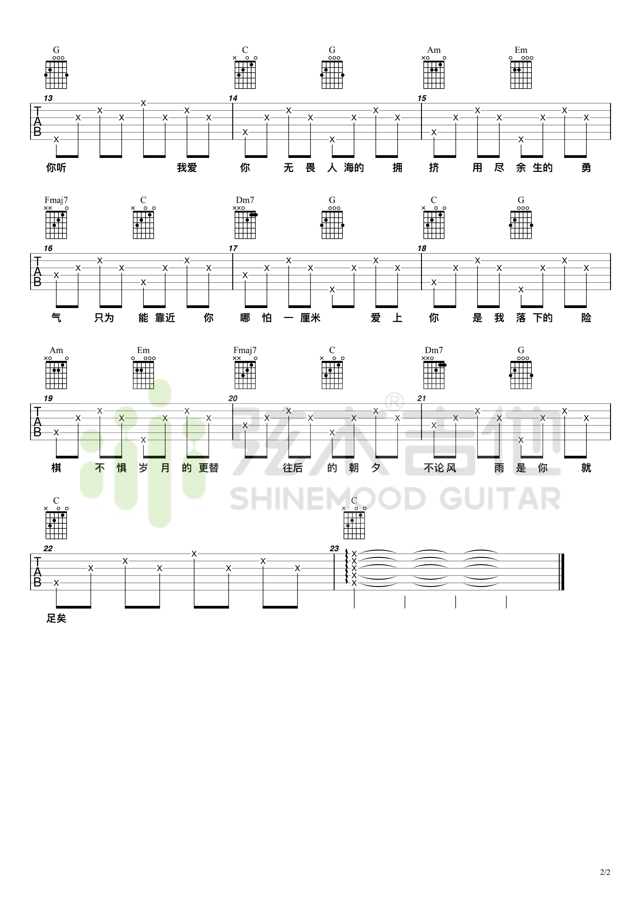 这是弦木吉他编配的《勇气》吉他谱,采用C调六线谱,变调夹夹在第四品位演奏,以清晰的分解和弦伴奏为主,简单的节奏使得整首曲子易于演奏。