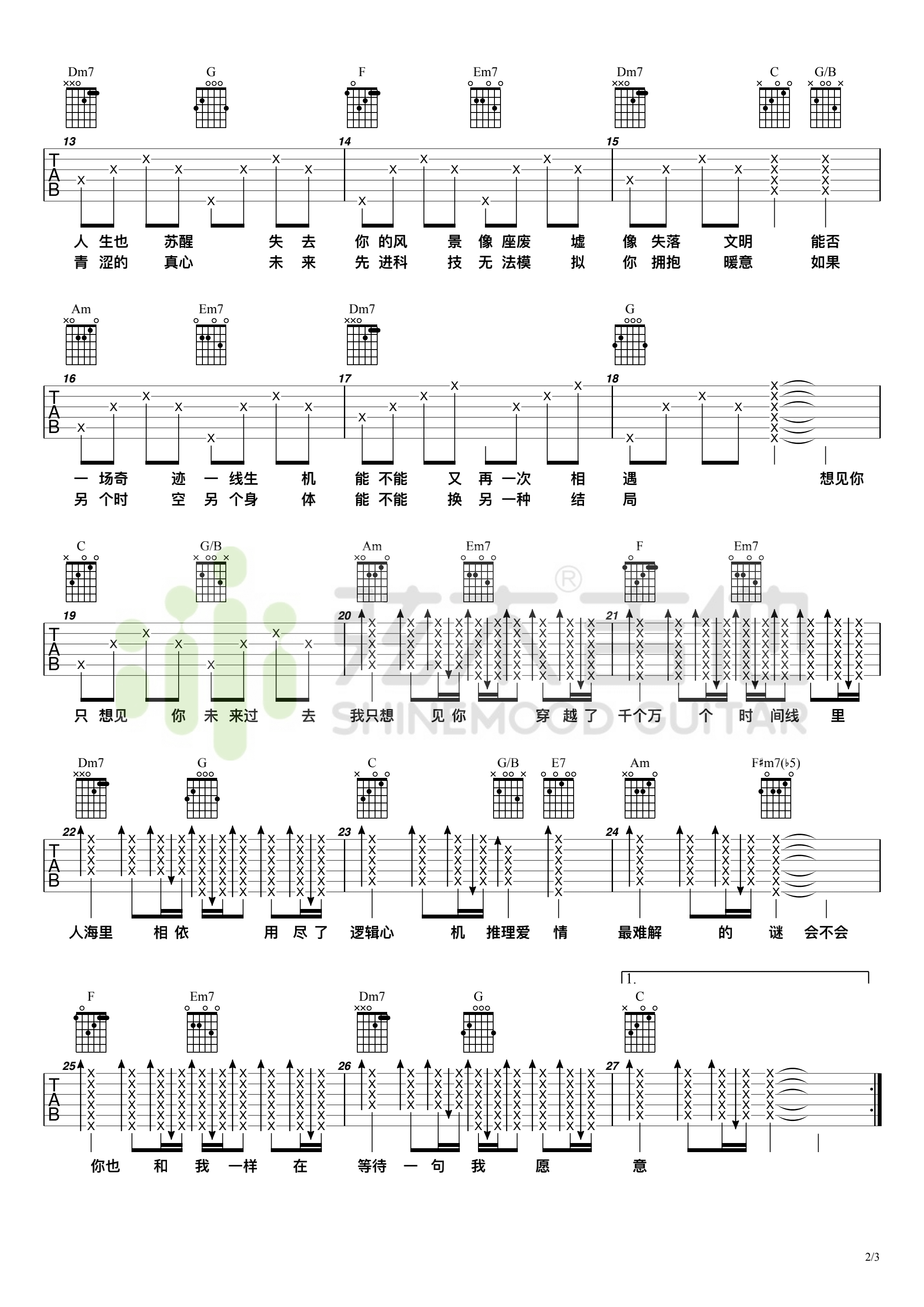 八三夭乐团的《想见你想见你想见》是电视剧《想见你》的主题曲,歌曲深情走心,跨越山海、时光,只为追寻心中的你。在千万时间线中,人海里相依,每一刻都只为了与你相见。八三夭的演唱与剧情贴切契合,曲风和歌词都充满了共情力。弦木吉他编配的吉他谱以C调指法六线谱为基础,允