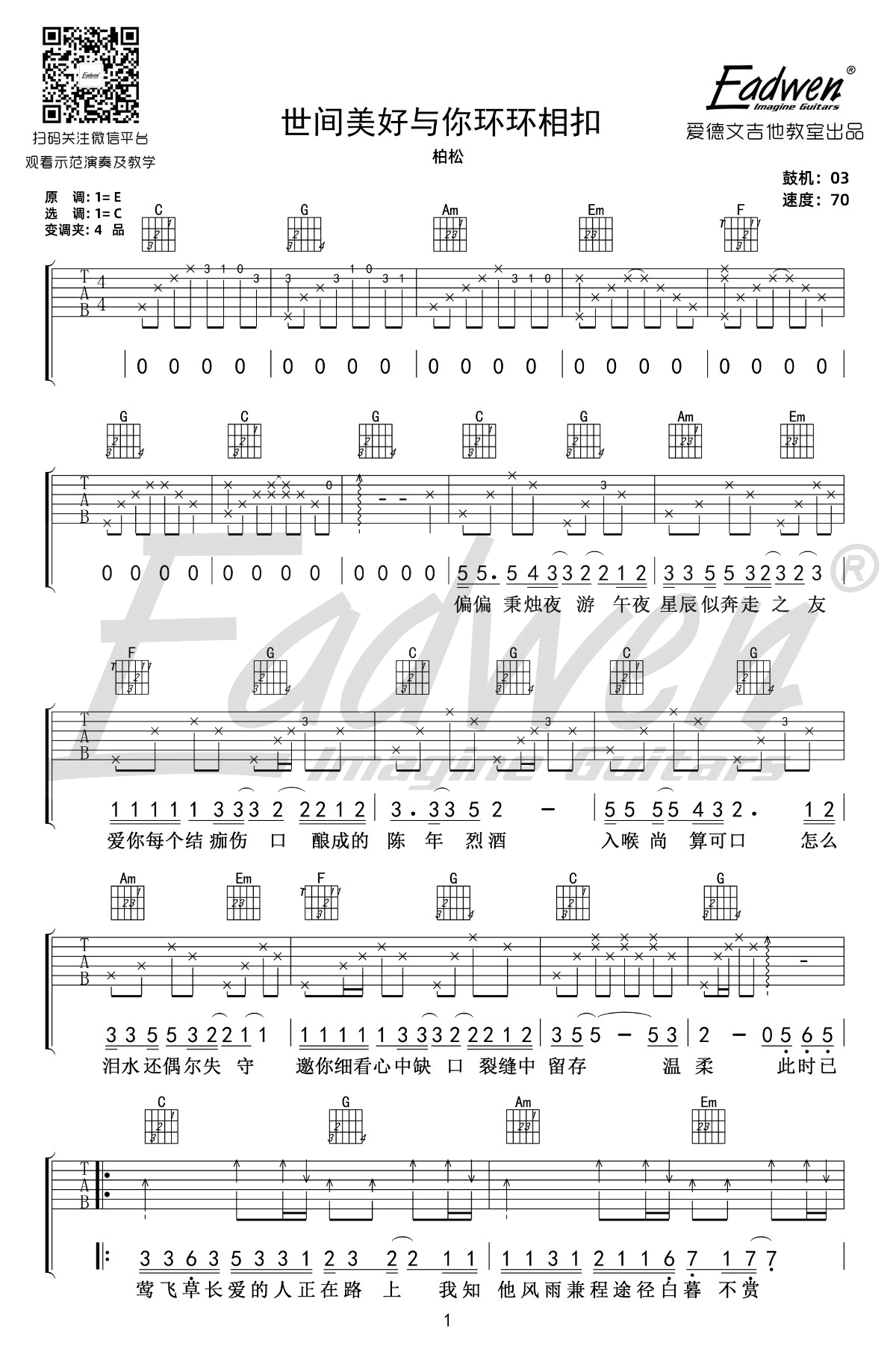 这是柏松演唱的一首网络热门歌曲《世间美好与你环环相扣》的吉他谱,原调E选调C,变调夹夹四品。由爱德文吉他教室编配出品,谱中融合了世间美好与你的情感,让音符在指尖跳跃,勾勒出一幅美妙的音乐画卷。吉他谱附有配套的弹唱教学视频,通过清晰的演示和详细的教学,为学习者提