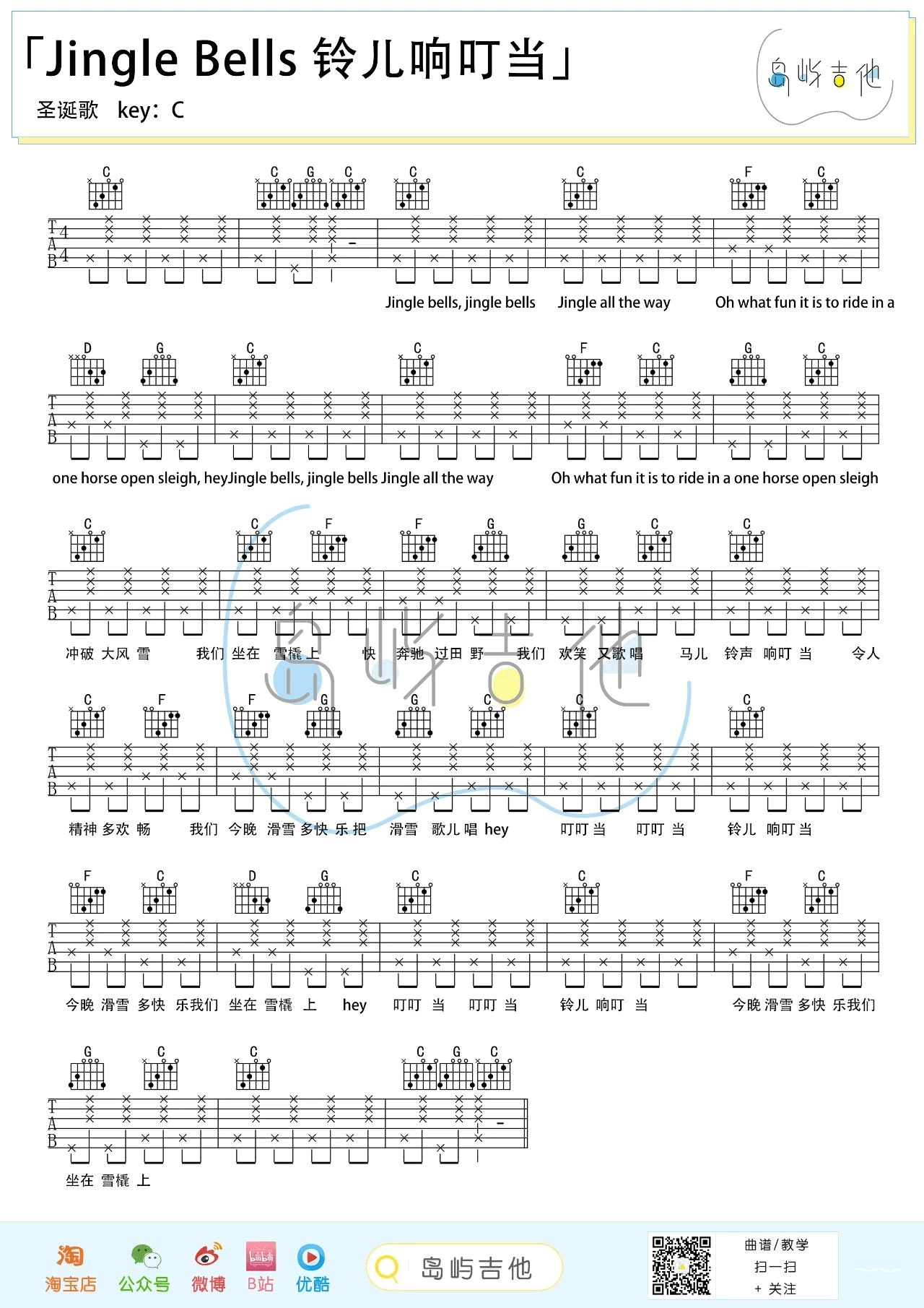 这是一首经典的圣诞歌曲,《Jingle Bells》吉他谱以清晰的C调和弦图片六线谱呈现,由岛屿吉他精心编排。演示视频展示了吉他弹唱的技巧,为学习者提供了详细的教学指导。在温馨的圣诞节氛围中,这首铃儿响叮当的歌曲勾勒出树木、麋鹿、圣诞老人和雪人等节日元素,唤起