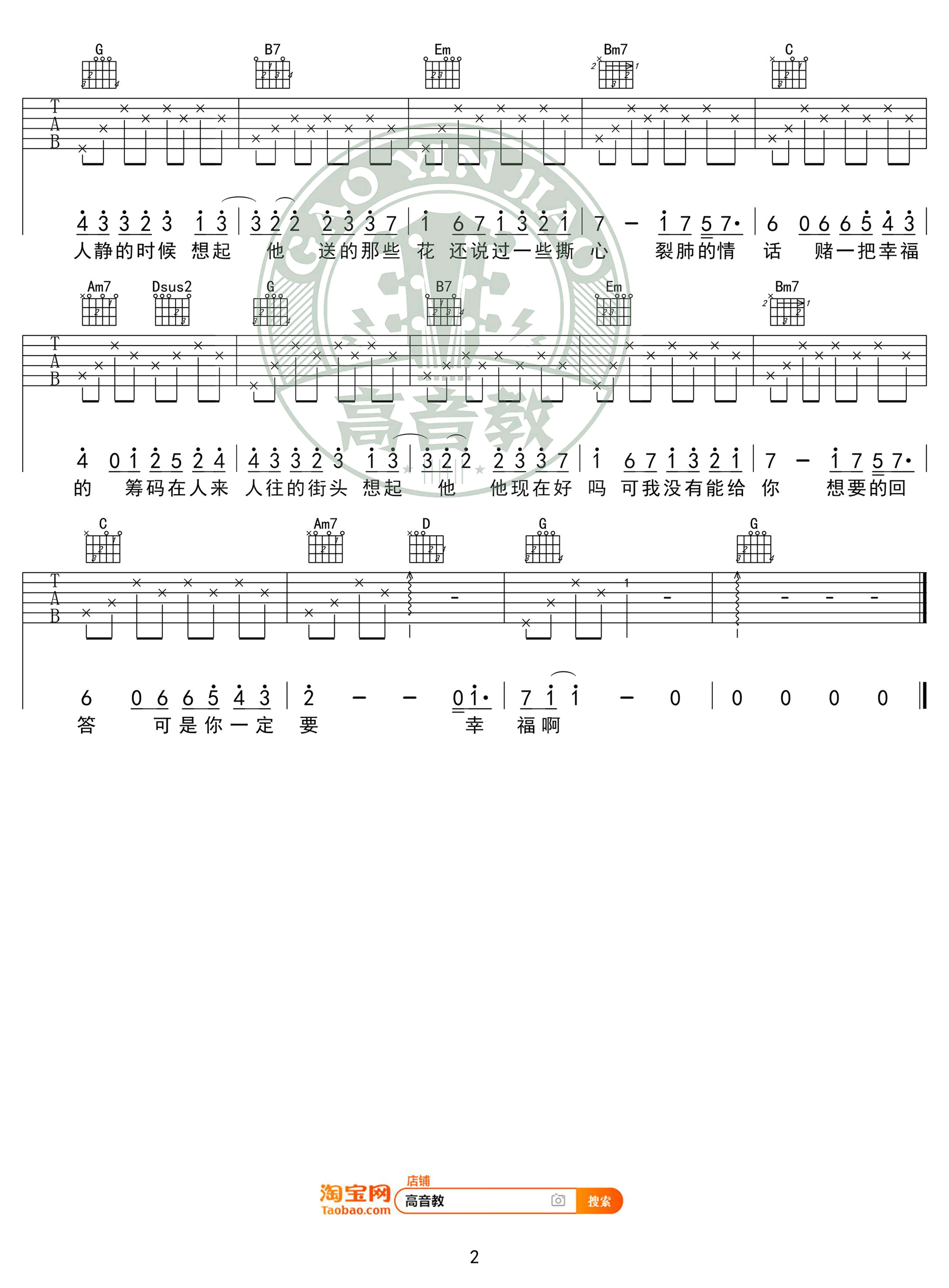 《你一定要幸福》是虎二翻唱何洁原唱的经典代表歌曲,呈现在六线谱中,原调A,采用G调指法,通过变调夹二品实现。这一版本由高音教精华版编排而成,吉他源整理并上传。