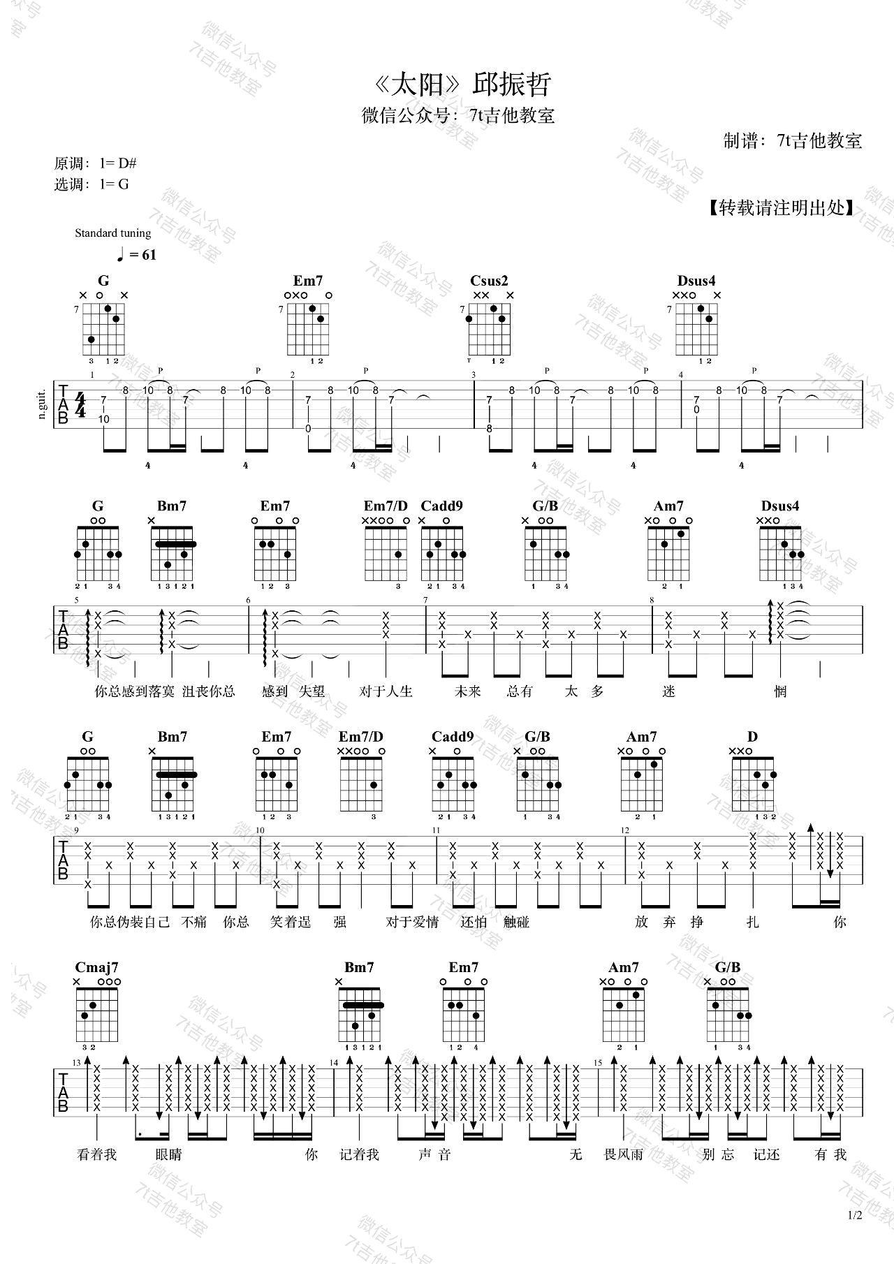 邱振哲演唱的《太阳》吉他谱以G大调编配,原调为D#大调,适合男生演唱,无需变调夹。中国好声音的马杰雪版本也选用G调,适合音域较高的女生演唱。对于想演绎邱振哲原调的歌迷,建议选择其他谱子,以免频繁使用变调夹。值得感谢7T吉他教室提供的编配制谱,视频中展示了标准音