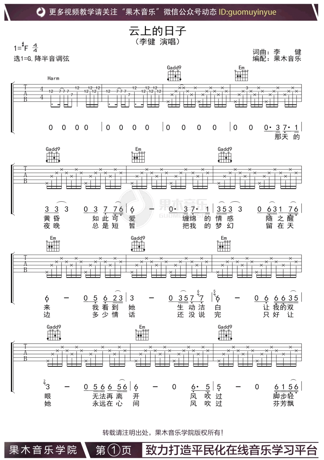 李健演唱的《云上的日子》以原调#F为基调,选调G并降半音调弦,呈现在六线谱上。该谱以两张清晰的弹唱图片谱形式呈现,由果木音乐编配分享,并在吉他源进行了更新上传。这首歌曲的谱子通过简洁直观的图示,为吉他爱好者提供了清晰易懂的演奏指导。通过这些音符和弦的编排,仿佛