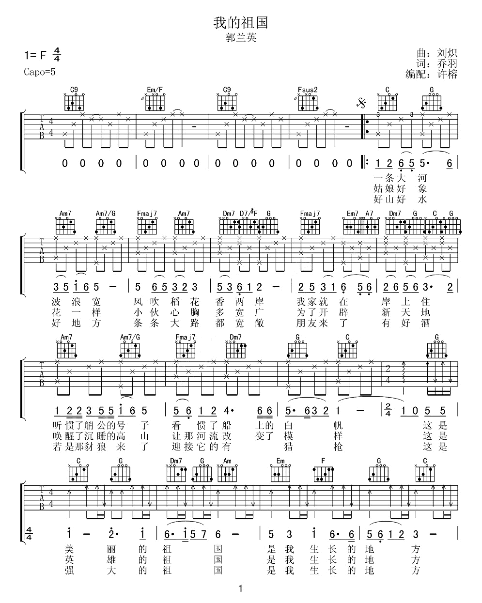 《郭兰英《我的祖国吉他谱》(C调)》内容来自于互联网,不能保证内容的准确性与完整性,仅供学习交流欣赏,请勿用于其它用途,内容版权归原作者及来源网站所有,如有侵犯到您的权益请来信告知,我们将及时删除。