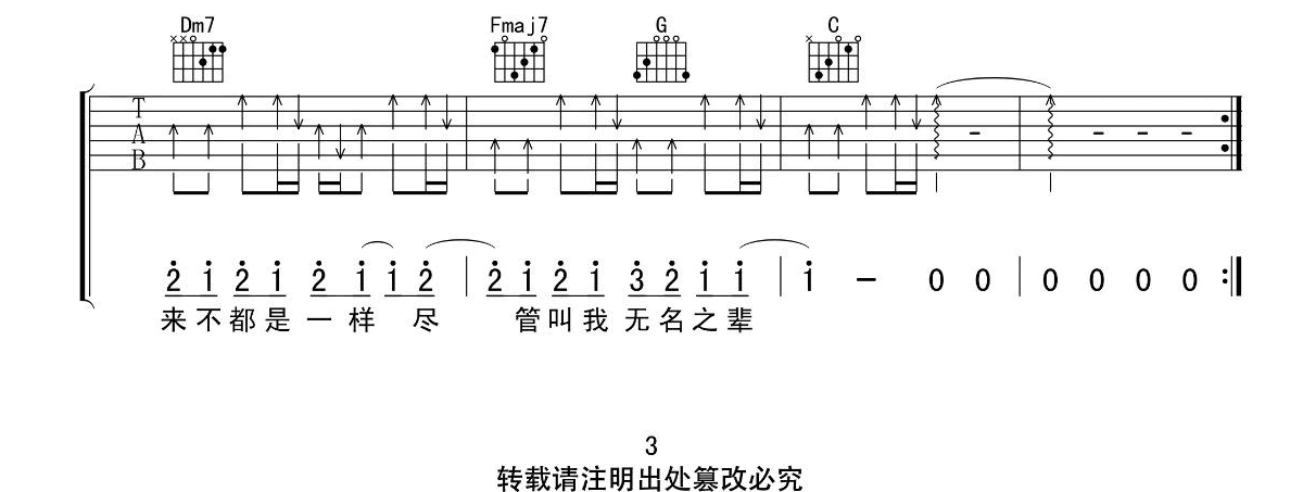 《陈雪燃《无名之辈吉他谱》(C调)》内容来自于互联网,不能保证内容的准确性与完整性,仅供学习交流欣赏,请勿用于其它用途,内容版权归原作者及来源网站所有,如有侵犯到您的权益请来信告知,我们将及时删除。