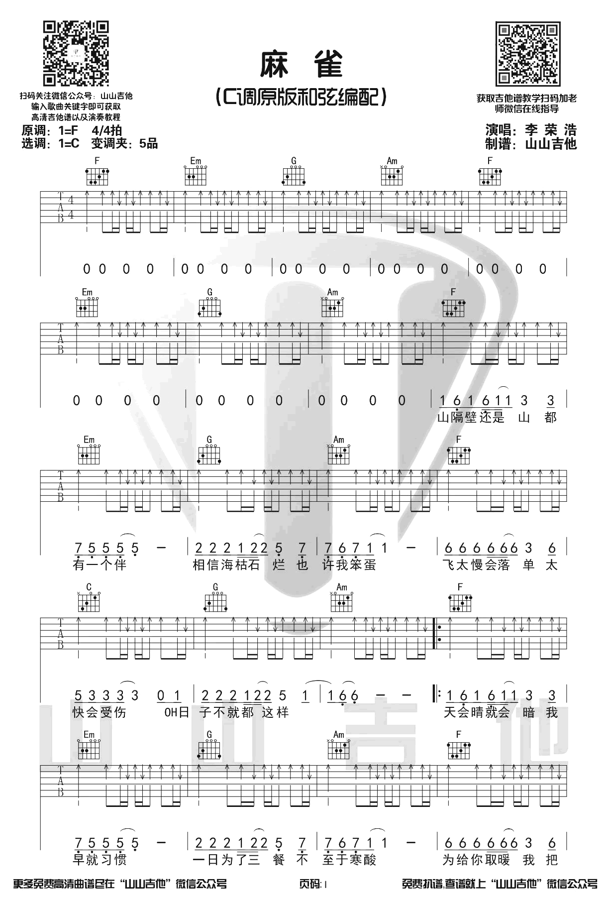 《李荣浩《麻雀吉他谱》(C调)》内容来自于互联网,不能保证内容的准确性与完整性,仅供学习交流欣赏,请勿用于其它用途,内容版权归原作者及来源网站所有,如有侵犯到您的权益请来信告知,我们将及时删除。