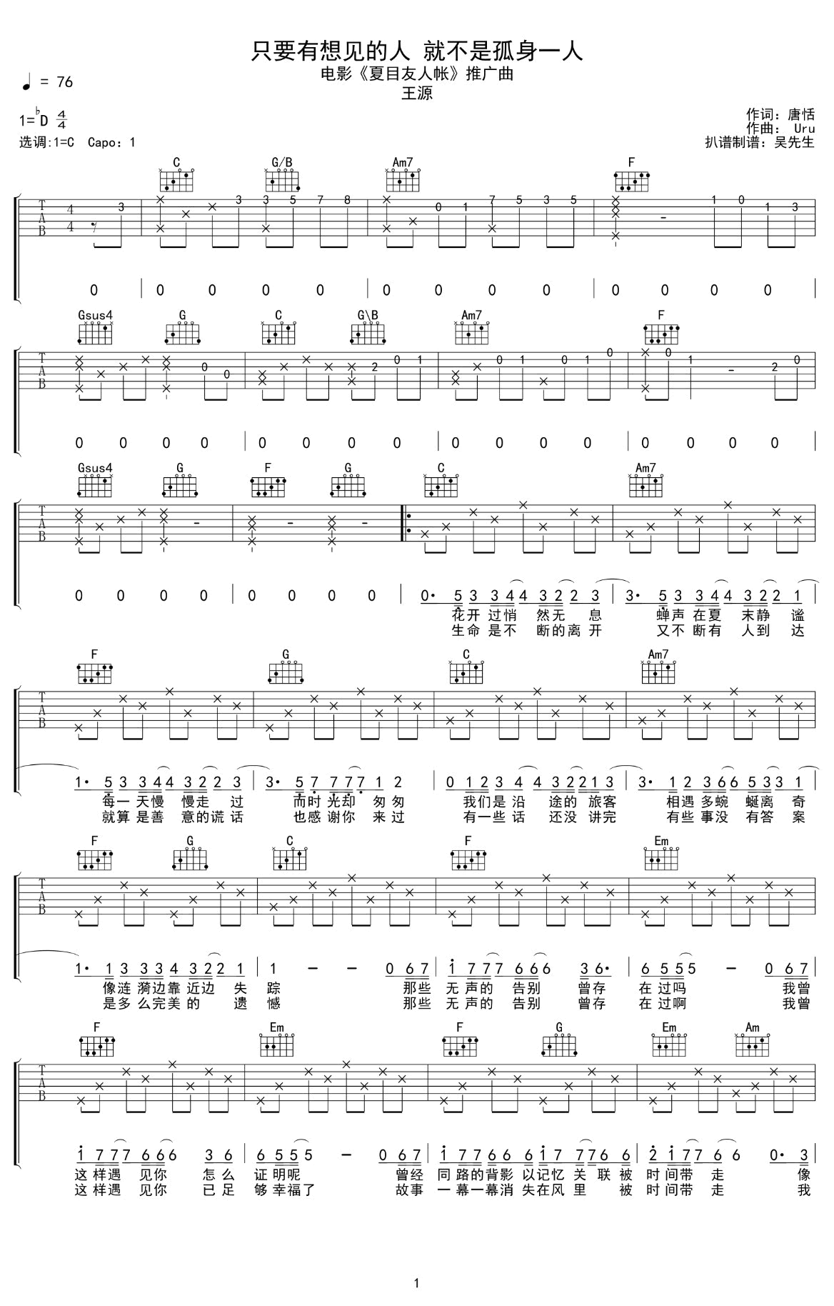 王源演唱的《只要有想见的人,就不是孤身一人》是温暖治愈的日本动画电影《夏目友人帐》的宣传推广曲。这首歌的吉他谱由吴先生编配,原调降B,选调C,使用了capo夹一品。谱中表达了一种深刻的情感,歌词中透露出对于重要的人的思念和渴望相见的情感。整体旋律轻柔舒缓,仿佛