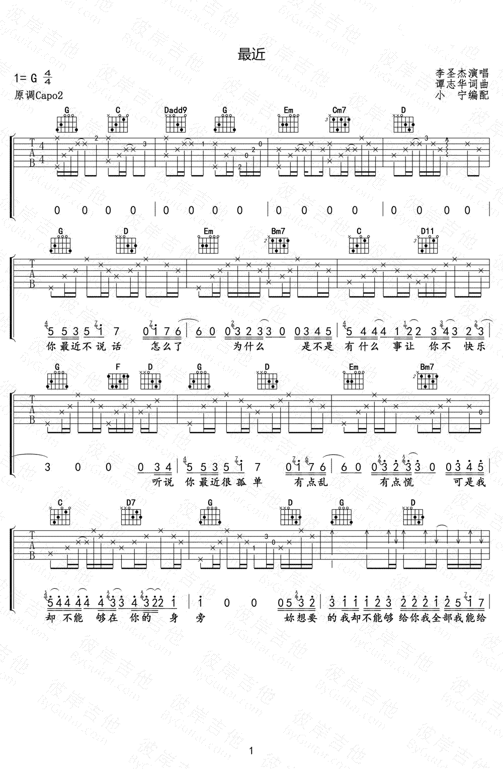 《李圣杰《最近吉他谱》(G调)》内容来自于互联网,不能保证内容的准确性与完整性,仅供学习交流欣赏,请勿用于其它用途,内容版权归原作者及来源网站所有,如有侵犯到您的权益请来信告知,我们将及时删除。