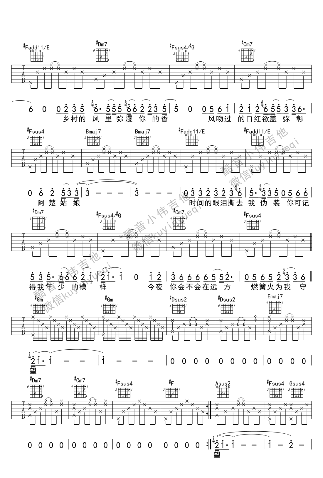 《袁娅维《阿楚姑娘 梁凡(袁娅维)吉他谱》》内容来自于互联网,不能保证内容的准确性与完整性,仅供学习交流欣赏,请勿用于其它用途,内容版权归原作者及来源网站所有,如有侵犯到您的权益请来信告知,我们将及时删除。