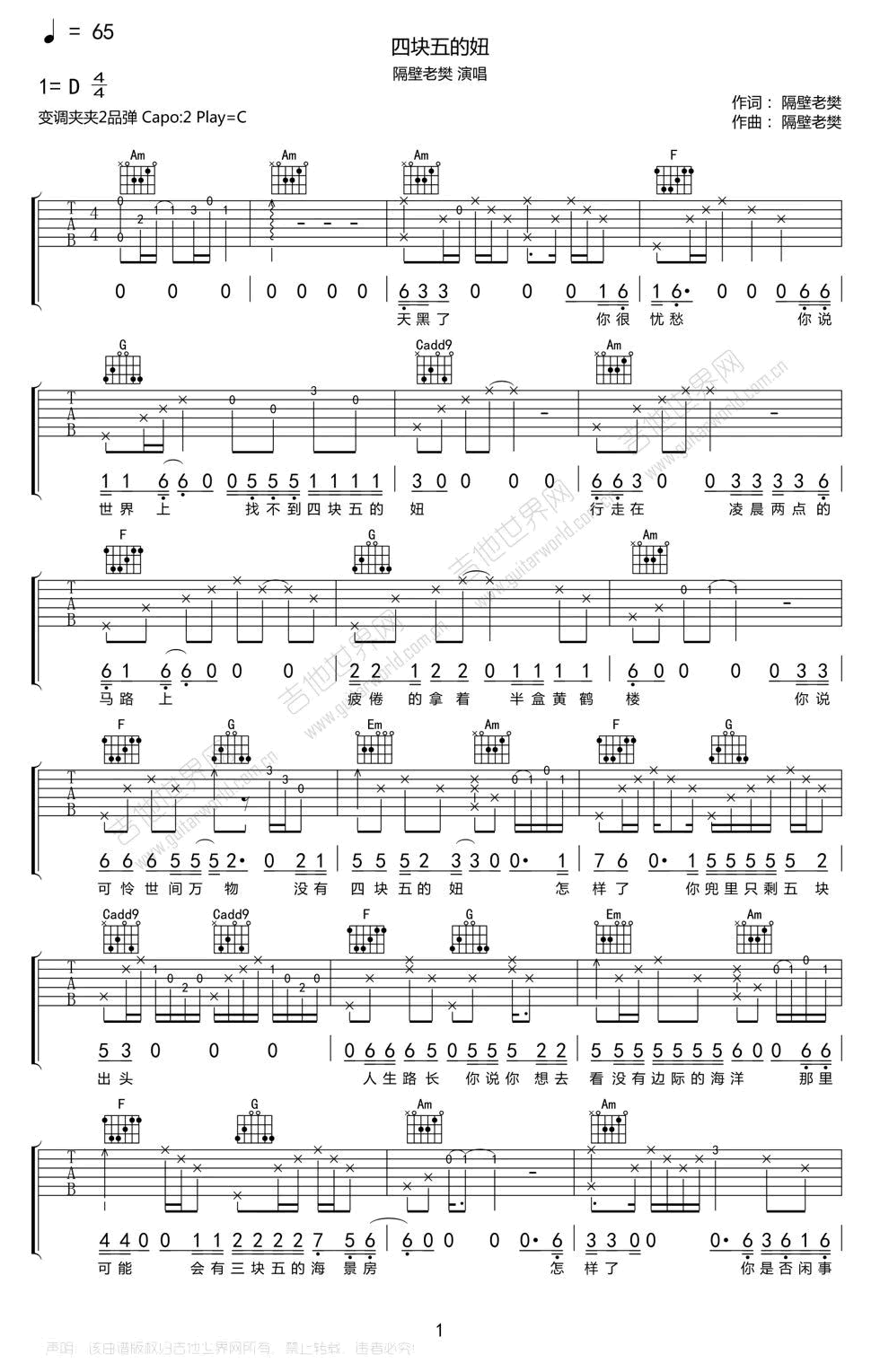 《隔壁老樊《四块五吉他谱》(C调)》内容来自于互联网,不能保证内容的准确性与完整性,仅供学习交流欣赏,请勿用于其它用途,内容版权归原作者及来源网站所有,如有侵犯到您的权益请来信告知,我们将及时删除。