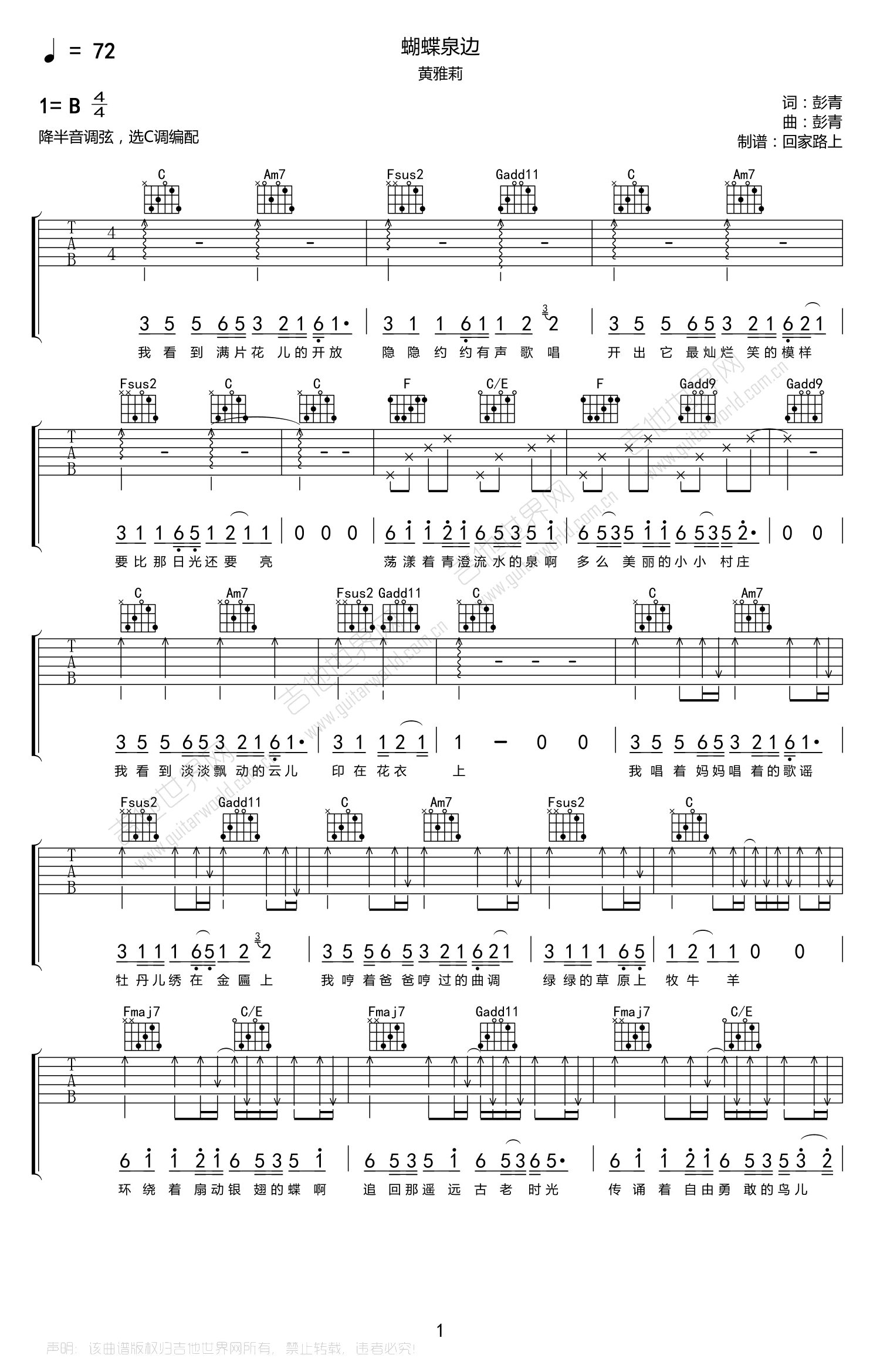 《黄雅莉《蝴蝶泉边吉他谱》(C调)》内容来自于互联网,不能保证内容的准确性与完整性,仅供学习交流欣赏,请勿用于其它用途,内容版权归原作者及来源网站所有,如有侵犯到您的权益请来信告知,我们将及时删除。