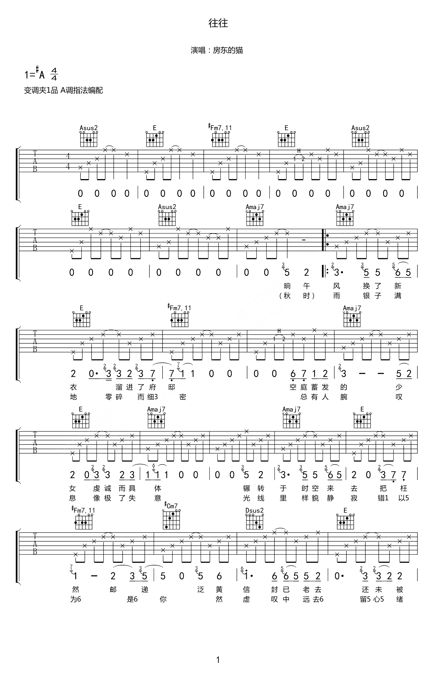 《往往》是由房东的猫演唱的歌曲,吉他谱采用原调#A,通过一品变调夹,选用A调指法编配。曲谱以六线谱形式呈现,同时提供高清弹唱图片谱,由吉他源琴友上传。