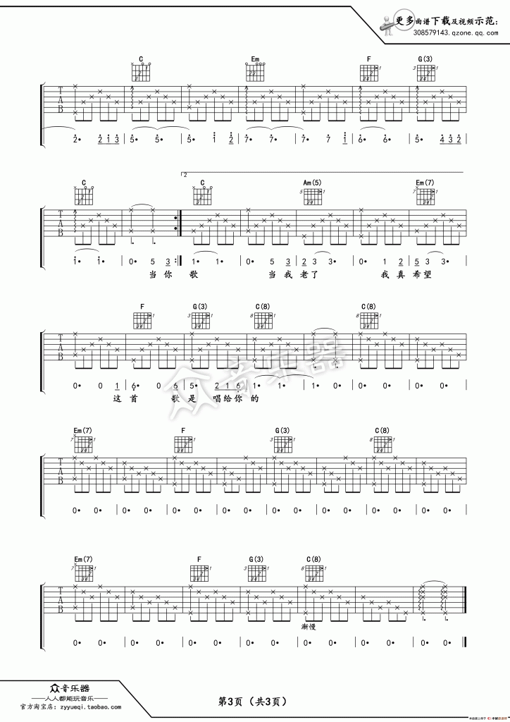 《赵照《当你老了吉他谱》》内容来自于互联网,不能保证内容的准确性与完整性,仅供学习交流欣赏,请勿用于其它用途,内容版权归原作者及来源网站所有,如有侵犯到您的权益请来信告知,我们将及时删除。