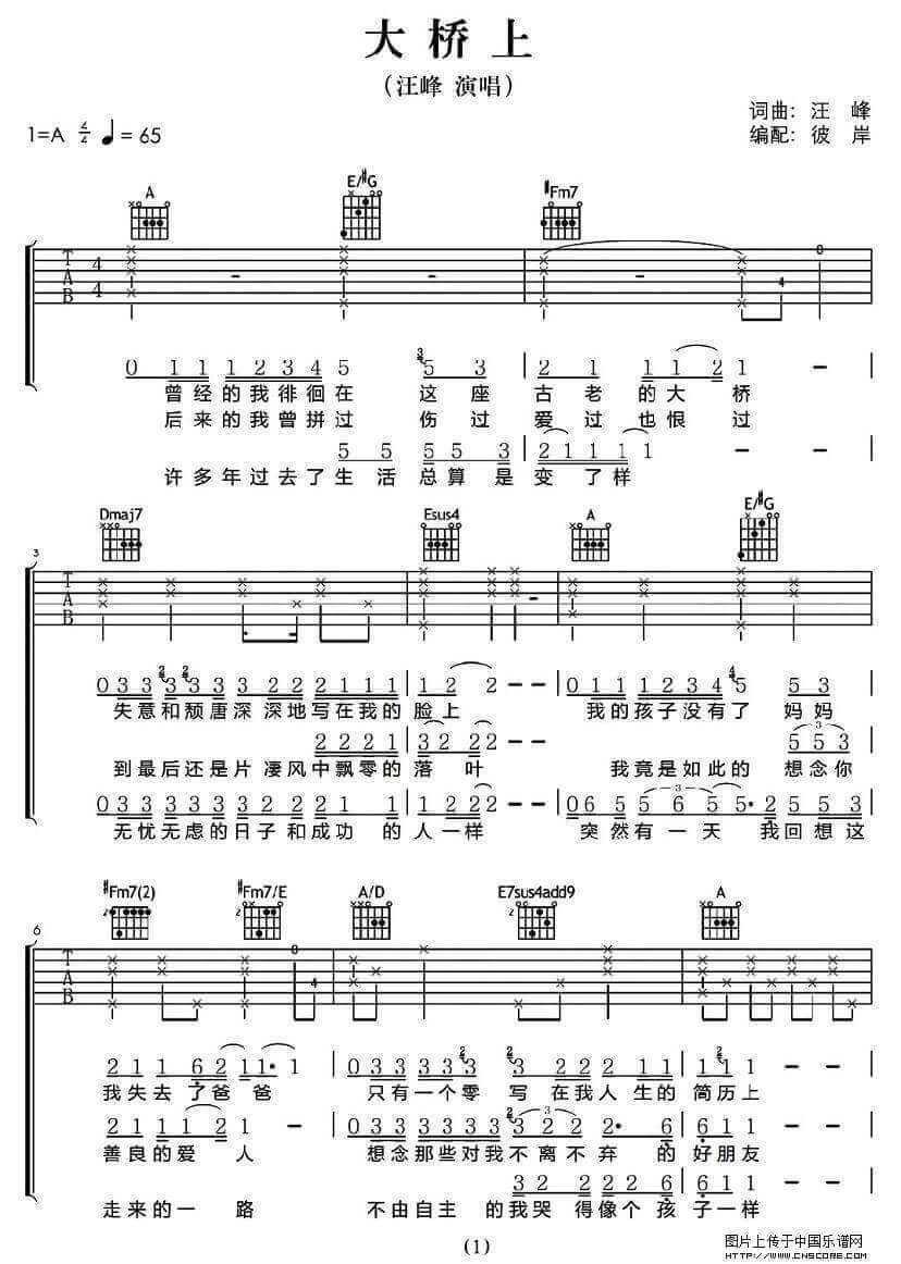 《汪峰《大桥上吉他谱》(A调)》内容来自于互联网,不能保证内容的准确性与完整性,仅供学习交流欣赏,请勿用于其它用途,内容版权归原作者及来源网站所有,如有侵犯到您的权益请来信告知,我们将及时删除。