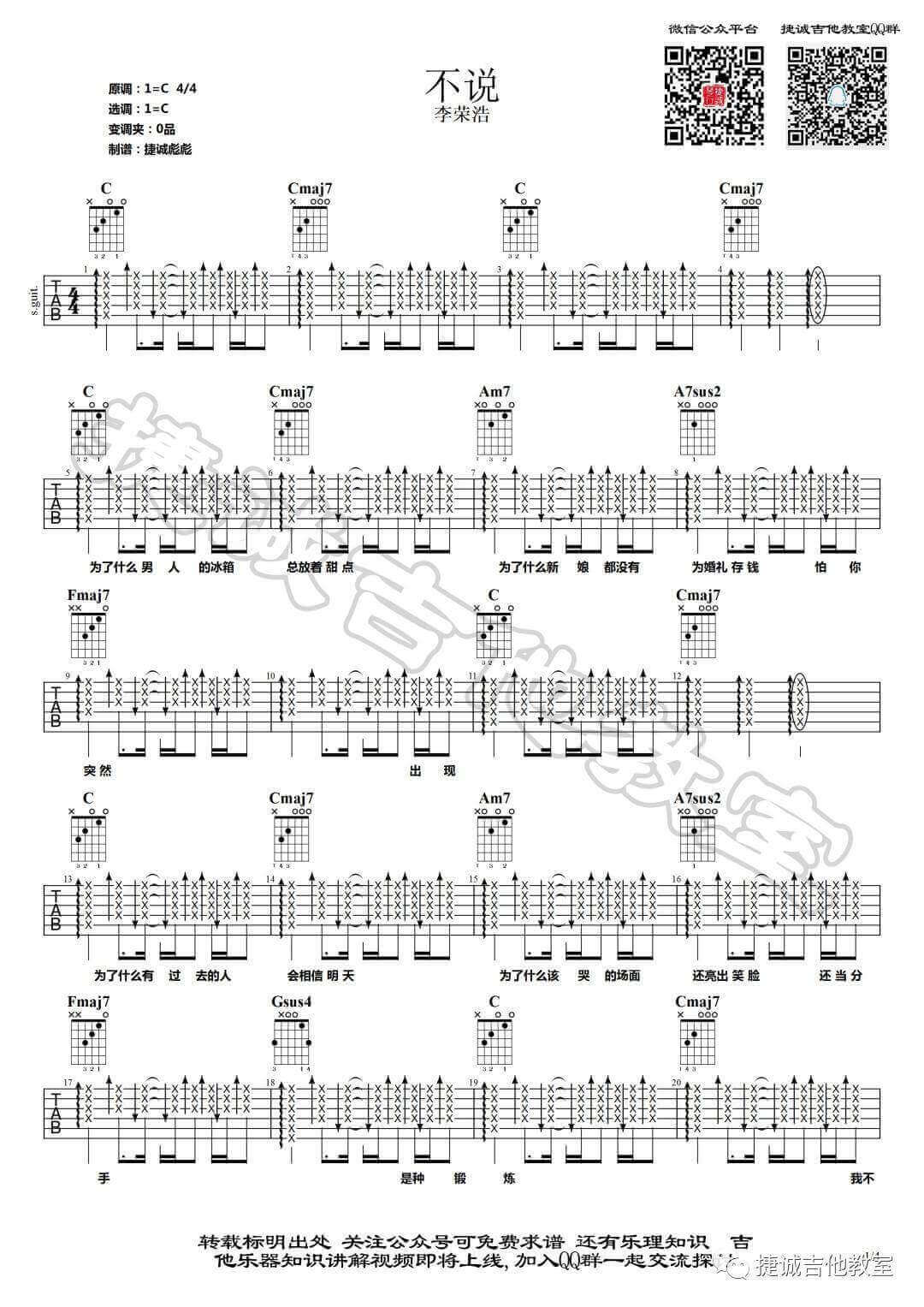 《李荣浩《不说吉他谱》(C调)》内容来自于互联网,不能保证内容的准确性与完整性,仅供学习交流欣赏,请勿用于其它用途,内容版权归原作者及来源网站所有,如有侵犯到您的权益请来信告知,我们将及时删除。