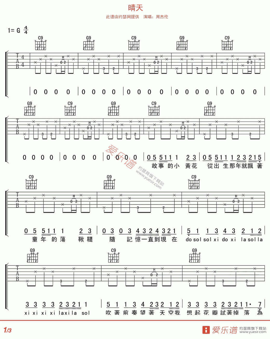 《周杰伦《晴天吉他谱》(G调)》内容来自于互联网,不能保证内容的准确性与完整性,仅供学习交流欣赏,请勿用于其它用途,内容版权归原作者及来源网站所有,如有侵犯到您的权益请来信告知,我们将及时删除。