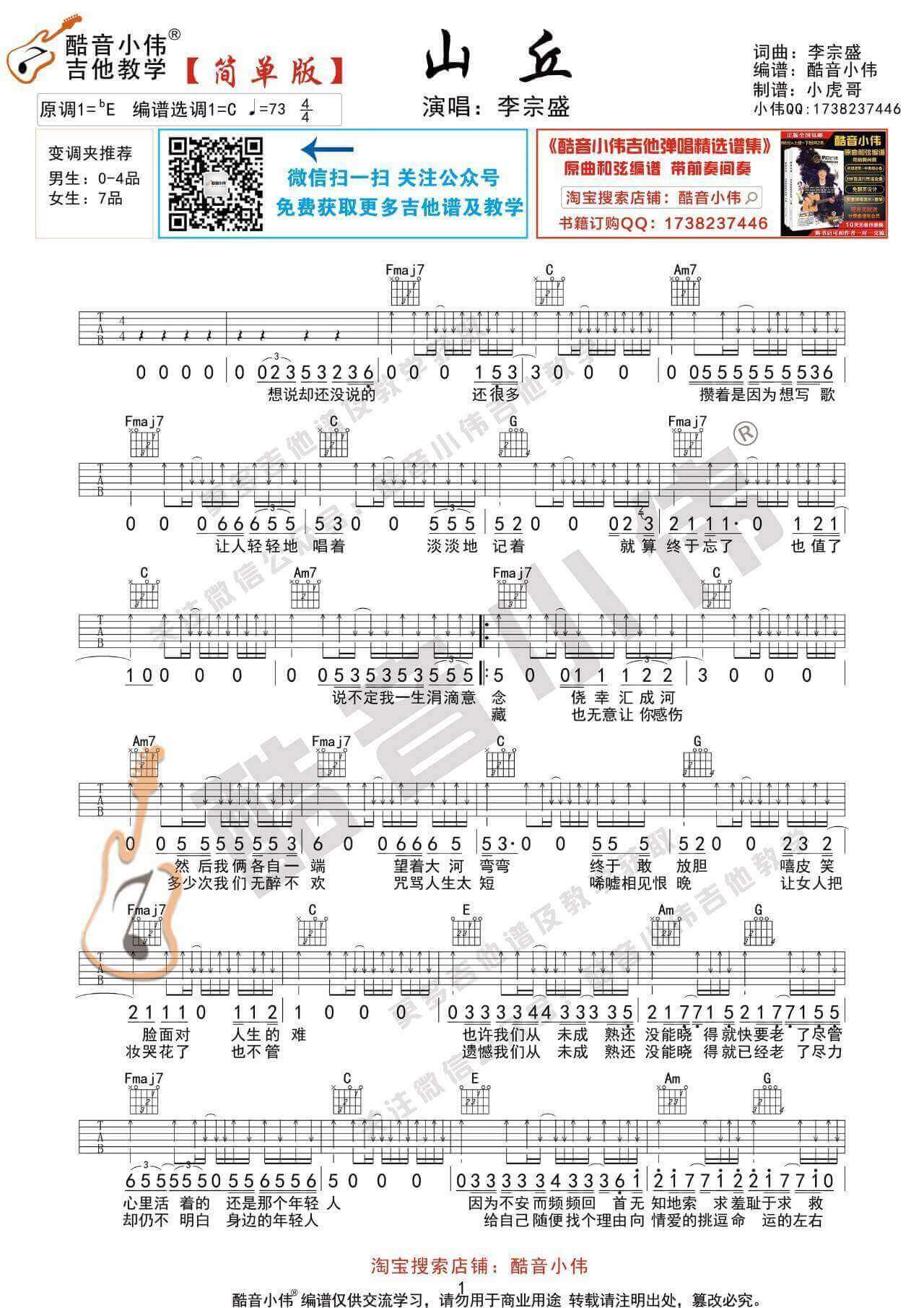 这首歌曲《山丘》以C调为基调,吉他谱由酷音小伟精心编配而成。这充满温暖的旋律仿佛带领着人们漫步在静谧的山丘之间。小巧而精致的指法散发着酷音小伟独特的音乐感悟,将每个音符串联成一幅如画的音乐画卷。这不仅是一首歌曲的谱曲,更是一种情感的传达。通过吉他的轻柔弹奏,歌