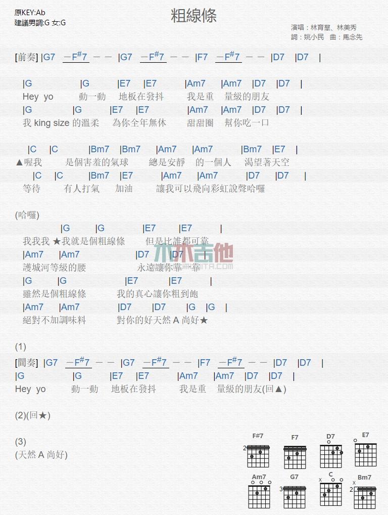 《《粗线条吉他谱》》内容来自于互联网,不能保证内容的准确性与完整性,仅供学习交流欣赏,请勿用于其它用途,内容版权归原作者及来源网站所有,如有侵犯到您的权益请来信告知,我们将及时删除。