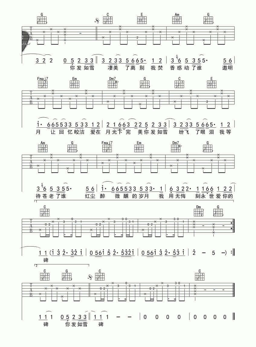 《周杰伦《发如雪吉他谱》(C调)》内容来自于互联网,不能保证内容的准确性与完整性,仅供学习交流欣赏,请勿用于其它用途,内容版权归原作者及来源网站所有,如有侵犯到您的权益请来信告知,我们将及时删除。