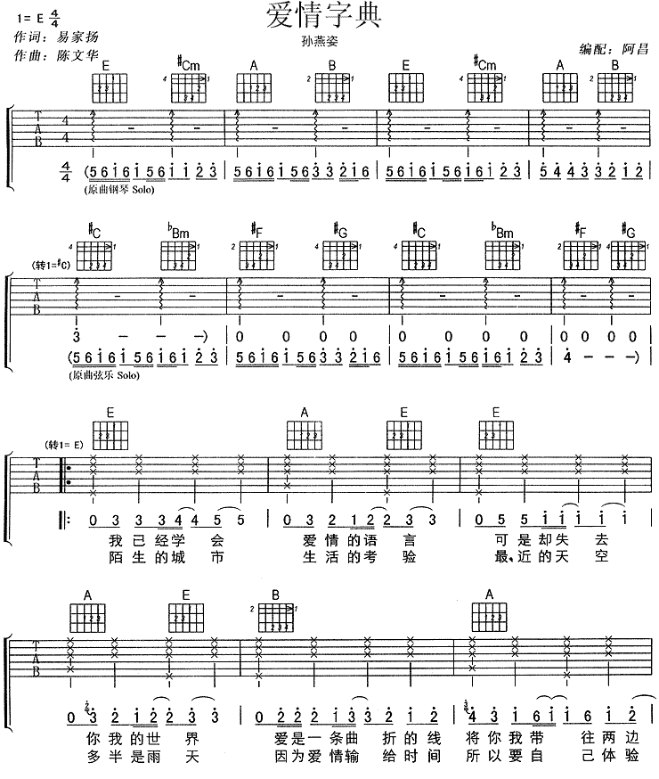 《孙燕姿《爱情字典吉他谱》(E调)》内容来自于互联网,不能保证内容的准确性与完整性,仅供学习交流欣赏,请勿用于其它用途,内容版权归原作者及来源网站所有,如有侵犯到您的权益请来信告知,我们将及时删除。