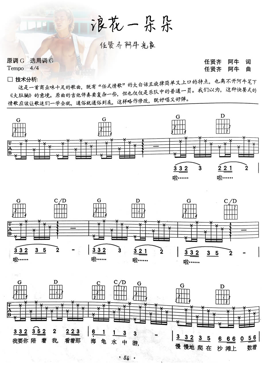 这首歌曲以原调G,由任贤齐、阿牛、光良演唱,吉他谱中呈现浪花一朵朵的画面。曲谱包括六线谱图片三张。这首商业歌曲融合了任式情歌的直白语言和简单、易记的旋律,受到了阿牛的《大肚腩》的启发。尽管原曲的吉他伴奏稍显复杂,但仍是普通乐队的标配之一。这是一首快餐式情歌,适