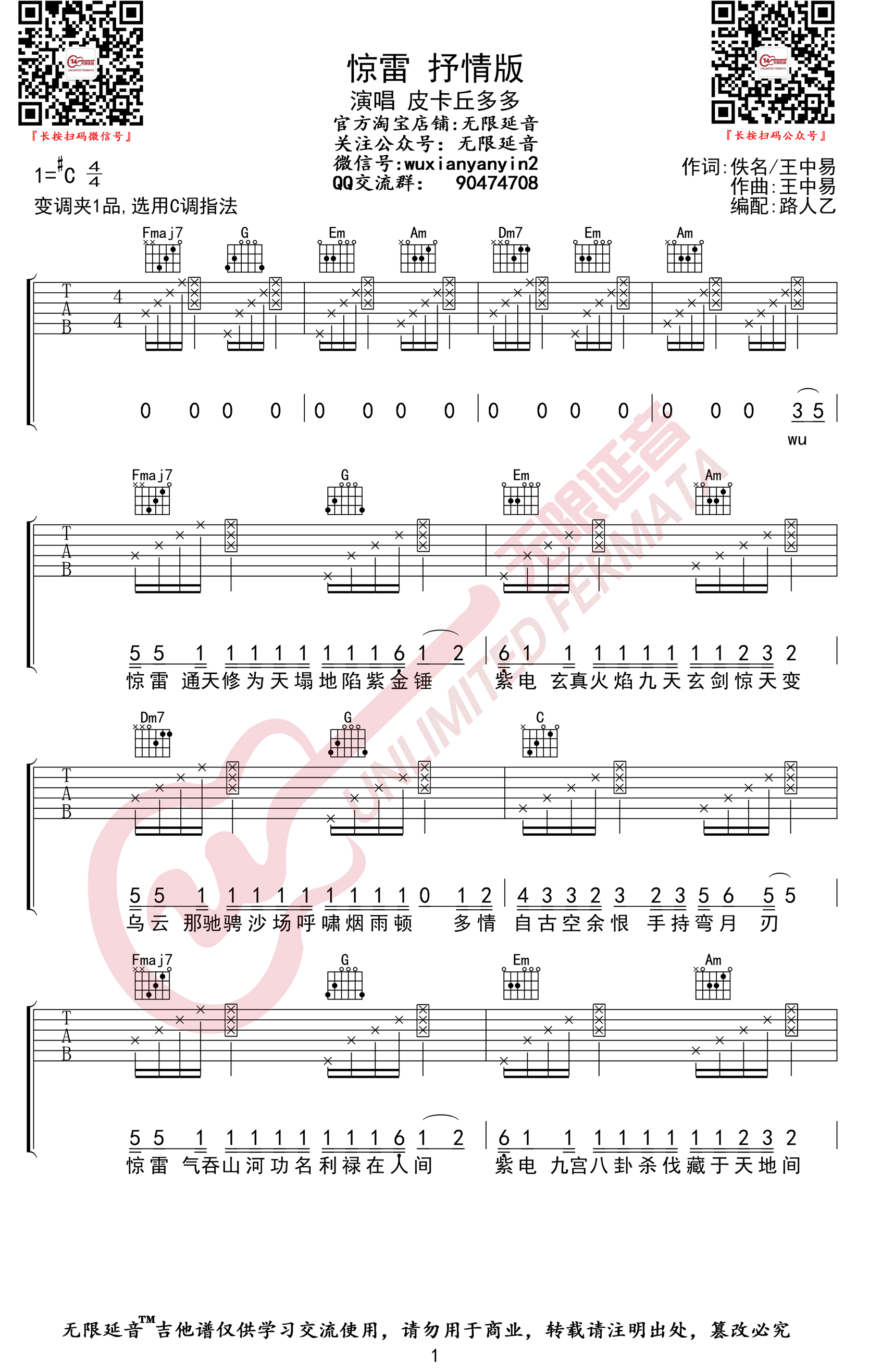 这是一份C调指法的吉他谱,通过变调夹1品弹唱,使用了无限延音编排。原唱为杨坤的《惊雷》,而这份谱子是翻唱版本。自从皮卡丘多多演唱的《惊雷 抒情版》问世后,这首抒情版歌曲以清新别致的感觉风靡网络。无限延音的拍弦版本让这首歌更加特别。《惊雷》在网络上有多个版本,但