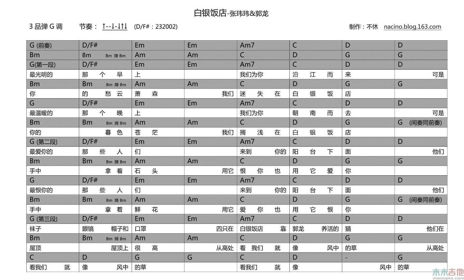 《张玮玮《白银饭店吉他谱》(G调)》内容来自于互联网,不能保证内容的准确性与完整性,仅供学习交流欣赏,请勿用于其它用途,内容版权归原作者及来源网站所有,如有侵犯到您的权益请来信告知,我们将及时删除。