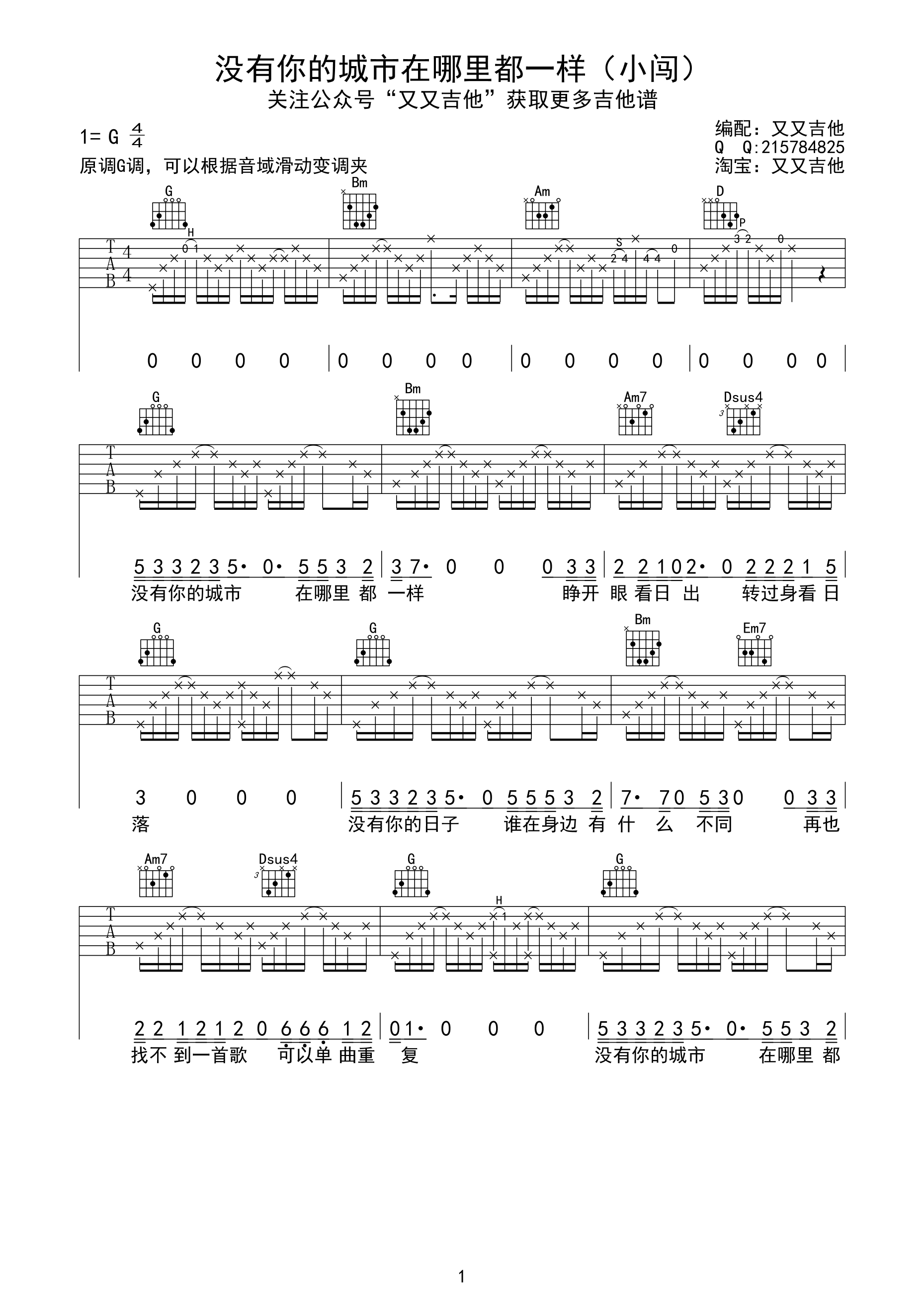 《宁静《没有你的城市在哪里都一样吉他谱》(G调)》内容来自于互联网,不能保证内容的准确性与完整性,仅供学习交流欣赏,请勿用于其它用途,内容版权归原作者及来源网站所有,如有侵犯到您的权益请来信告知,我们将及时删除。