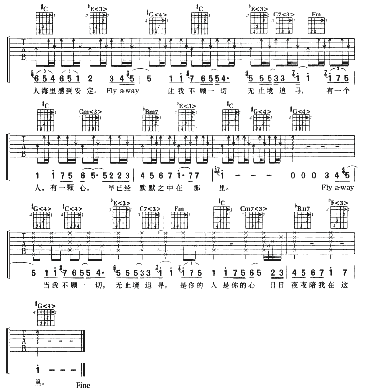 《虫虫《Fly Away吉他谱》(C调)》内容来自于互联网,不能保证内容的准确性与完整性,仅供学习交流欣赏,请勿用于其它用途,内容版权归原作者及来源网站所有,如有侵犯到您的权益请来信告知,我们将及时删除。