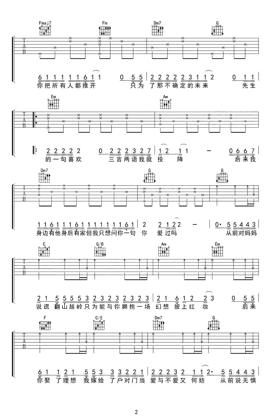 小阿七的歌曲《从前说》以其舒缓悲伤的旋律,深刻地述说了一段为爱情奋不顾身的故事。歌曲通过女生的视角,从热烈的开始演绎到最终的遗憾结局,充满感情的叙述让人产生强烈的共鸣。谱曲以原调E为基础,通过变调夹夹第四品,选用C调指法,呈现出完整编配版本,共有四张图片。即便