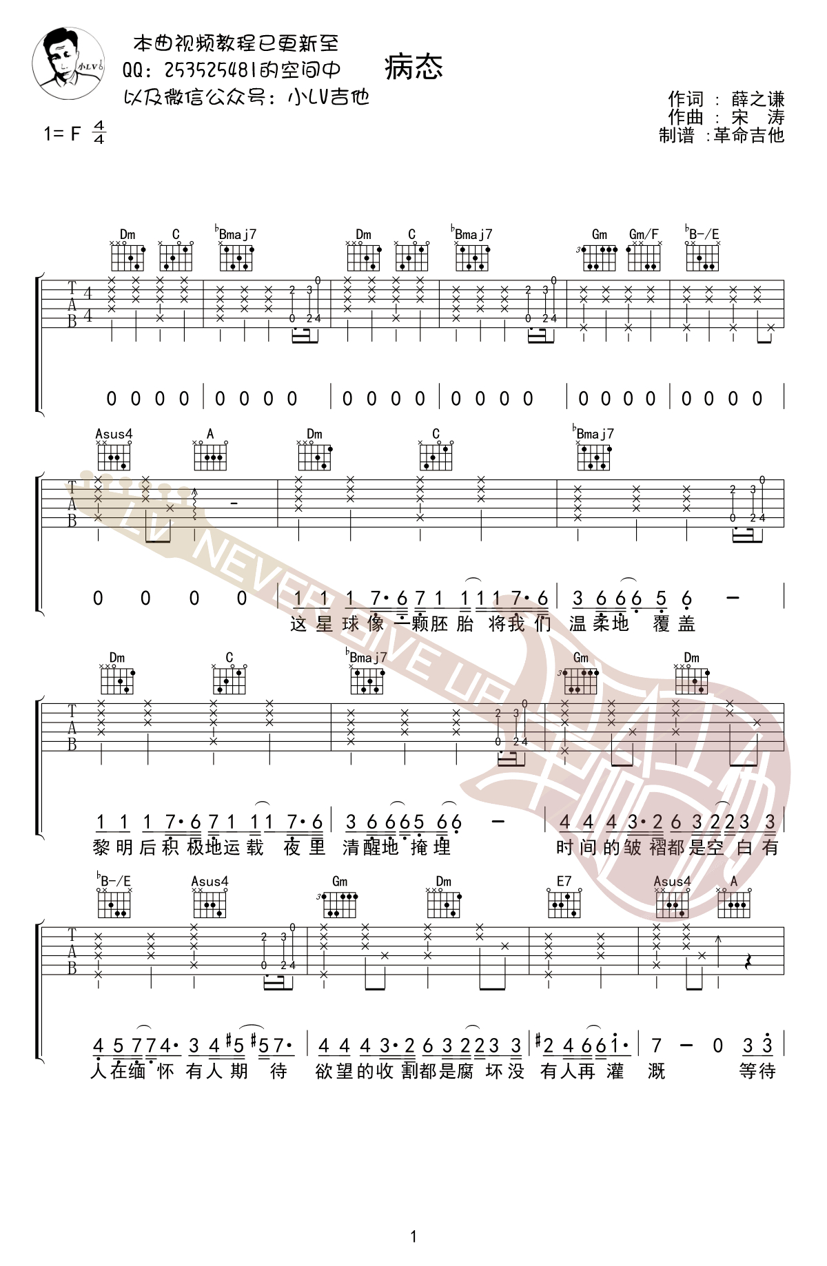 《薛之谦《病态吉他谱》(F调)》内容来自于互联网,不能保证内容的准确性与完整性,仅供学习交流欣赏,请勿用于其它用途,内容版权归原作者及来源网站所有,如有侵犯到您的权益请来信告知,我们将及时删除。