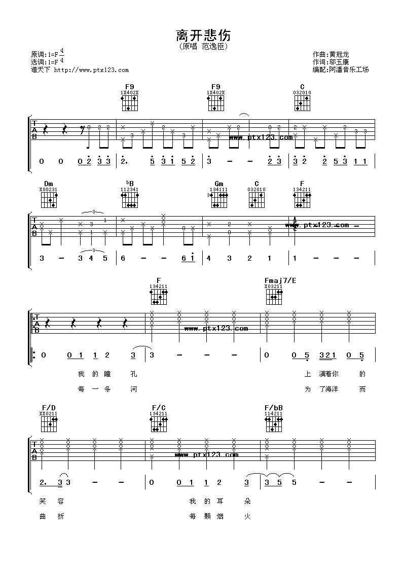 《范逸臣《离开悲伤吉他谱》(F调)》内容来自于互联网,不能保证内容的准确性与完整性,仅供学习交流欣赏,请勿用于其它用途,内容版权归原作者及来源网站所有,如有侵犯到您的权益请来信告知,我们将及时删除。
