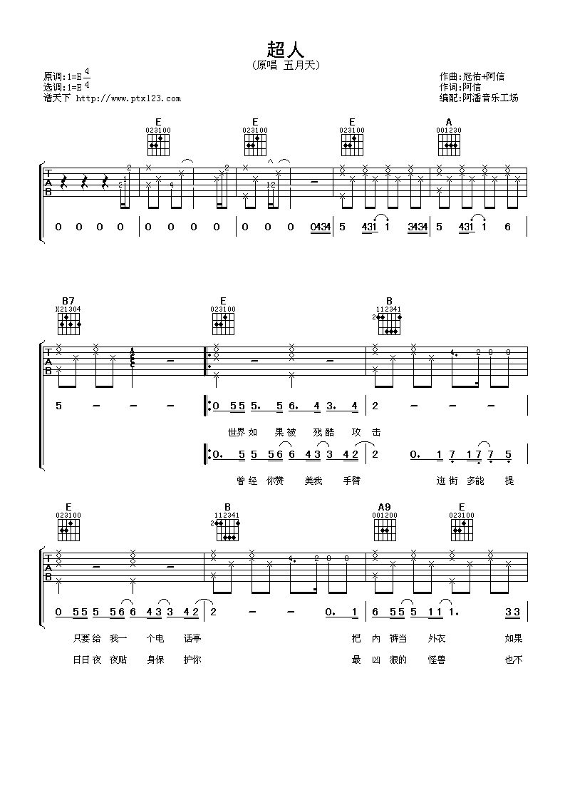 《悦耳动听《超人吉他谱》(E调)》内容来自于互联网,不能保证内容的准确性与完整性,仅供学习交流欣赏,请勿用于其它用途,内容版权归原作者及来源网站所有,如有侵犯到您的权益请来信告知,我们将及时删除。