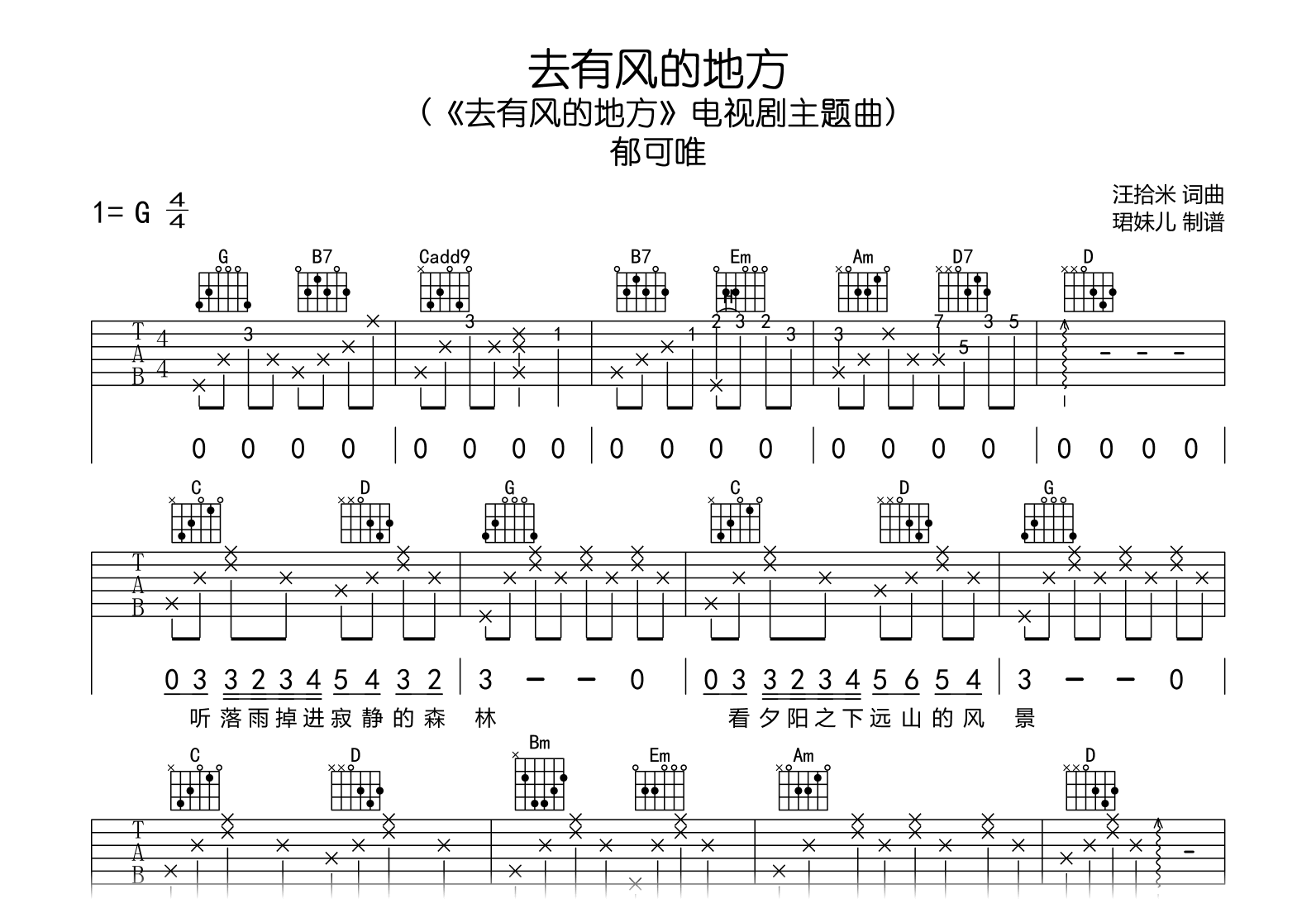 《郁可唯《去有风的地方吉他谱》(G调)》内容来自于互联网,不能保证内容的准确性与完整性,仅供学习交流欣赏,请勿用于其它用途,内容版权归原作者及来源网站所有,如有侵犯到您的权益请来信告知,我们将及时删除。