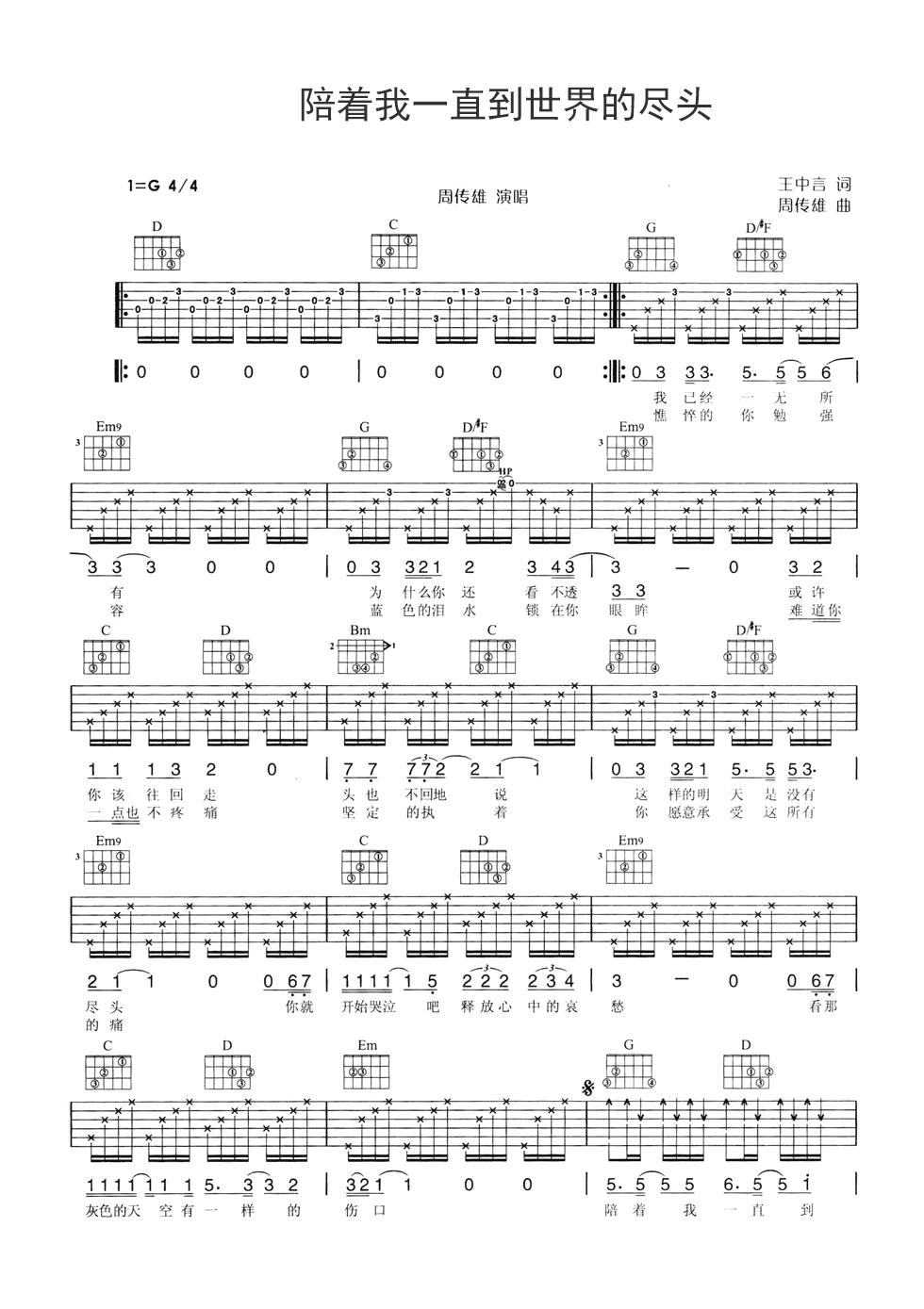 《周传雄《陪着我一直到世界的尽头吉他谱》(G调)》内容来自于互联网,不能保证内容的准确性与完整性,仅供学习交流欣赏,请勿用于其它用途,内容版权归原作者及来源网站所有,如有侵犯到您的权益请来信告知,我们将及时删除。