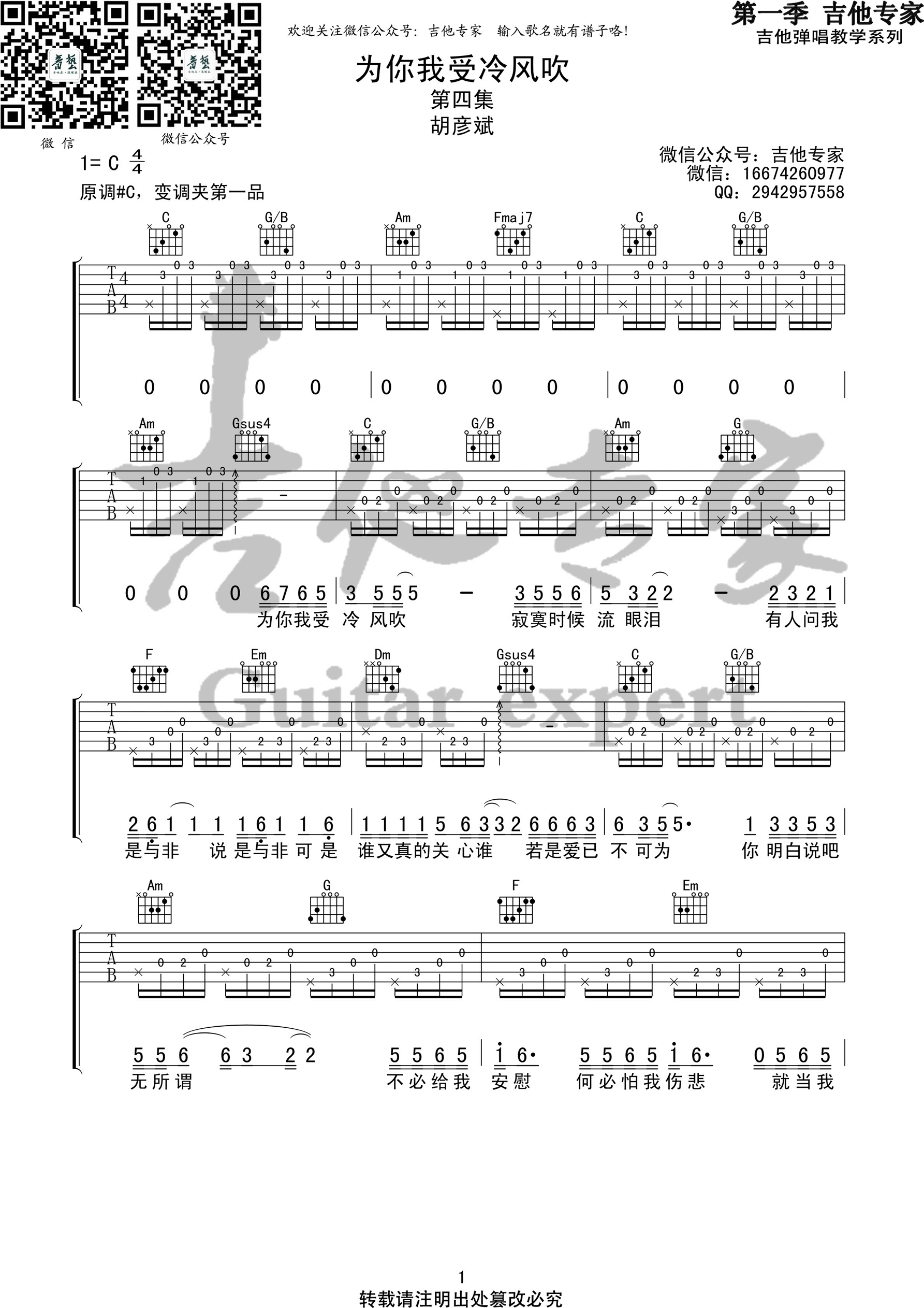 《胡彦斌《为你我受冷风吹吉他谱》(C调)》内容来自于互联网,不能保证内容的准确性与完整性,仅供学习交流欣赏,请勿用于其它用途,内容版权归原作者及来源网站所有,如有侵犯到您的权益请来信告知,我们将及时删除。