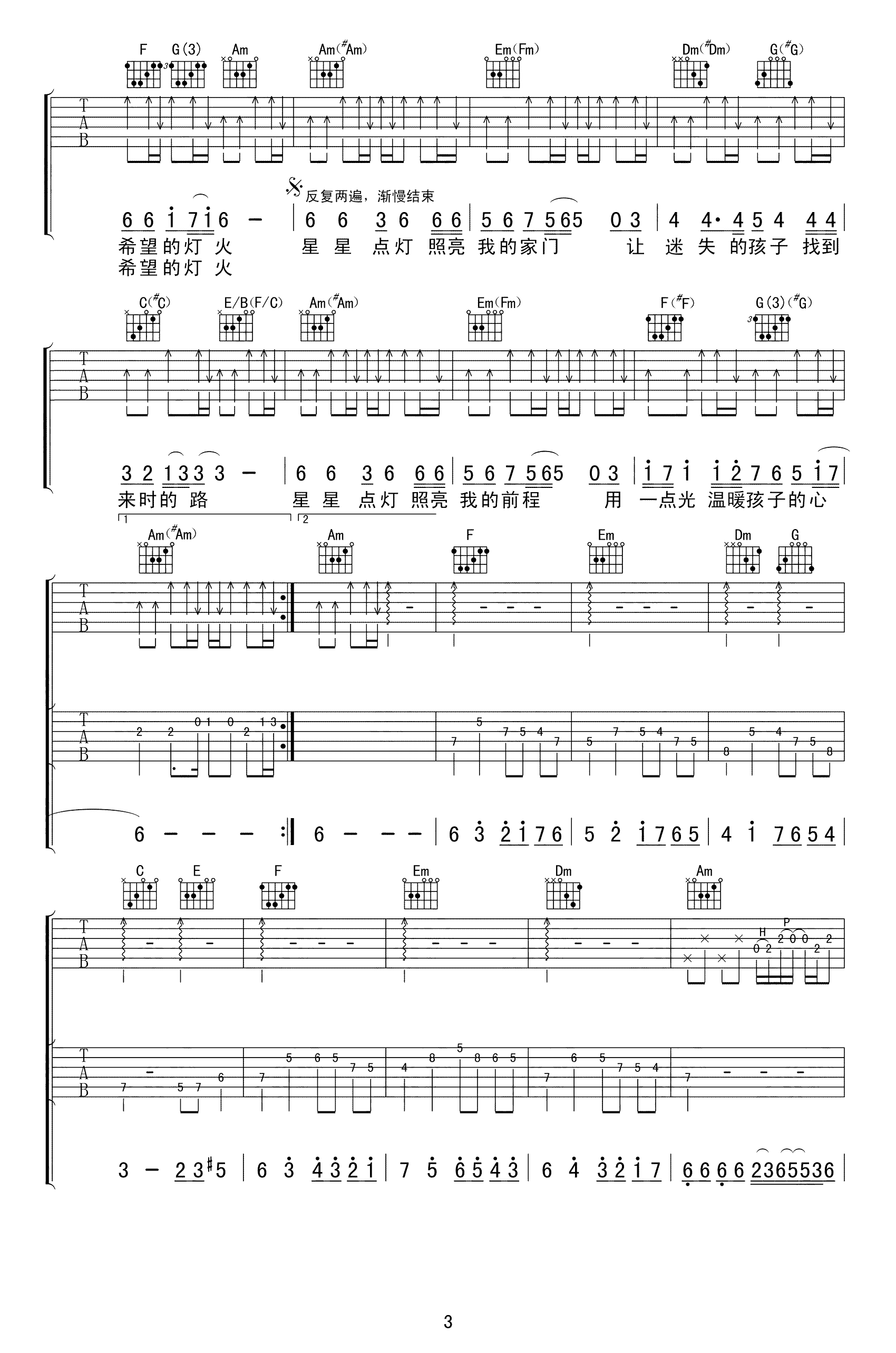 郑智化经典歌曲《星星点灯》吉他谱,采用C调指法编配,Capo夹四品,六线谱分为四张图片。这首歌曲以双吉他演奏前奏和间奏,展现出温暖与光明。描述着每个人内心深处曾有的黑暗时刻,希望那些点点星光能够照亮并温暖每一颗孤独的心。这些琴谱图示了如何演奏这首歌曲,更像是一