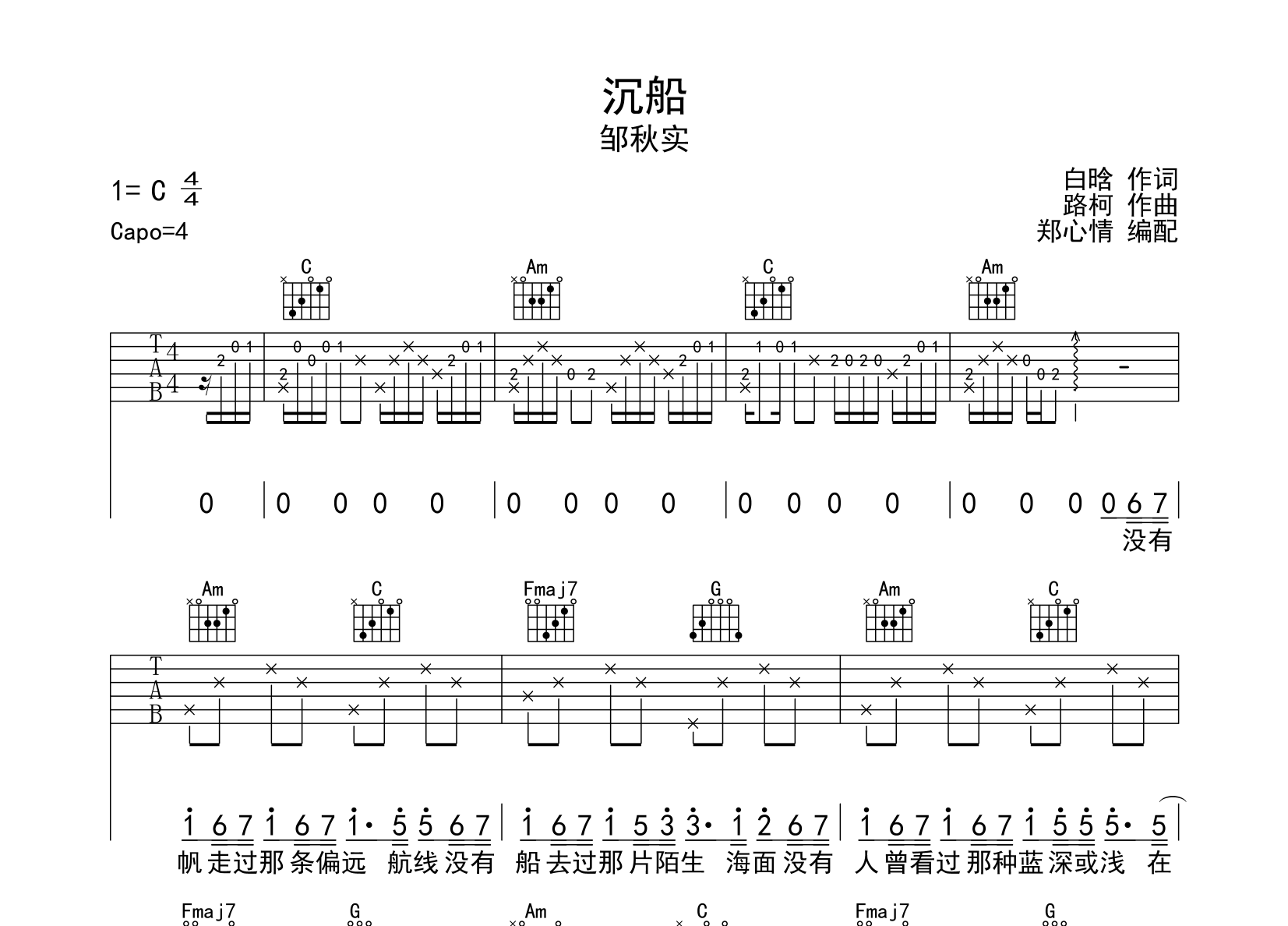 《邹秋实《沉船吉他谱》(C调)》内容来自于互联网,不能保证内容的准确性与完整性,仅供学习交流欣赏,请勿用于其它用途,内容版权归原作者及来源网站所有,如有侵犯到您的权益请来信告知,我们将及时删除。