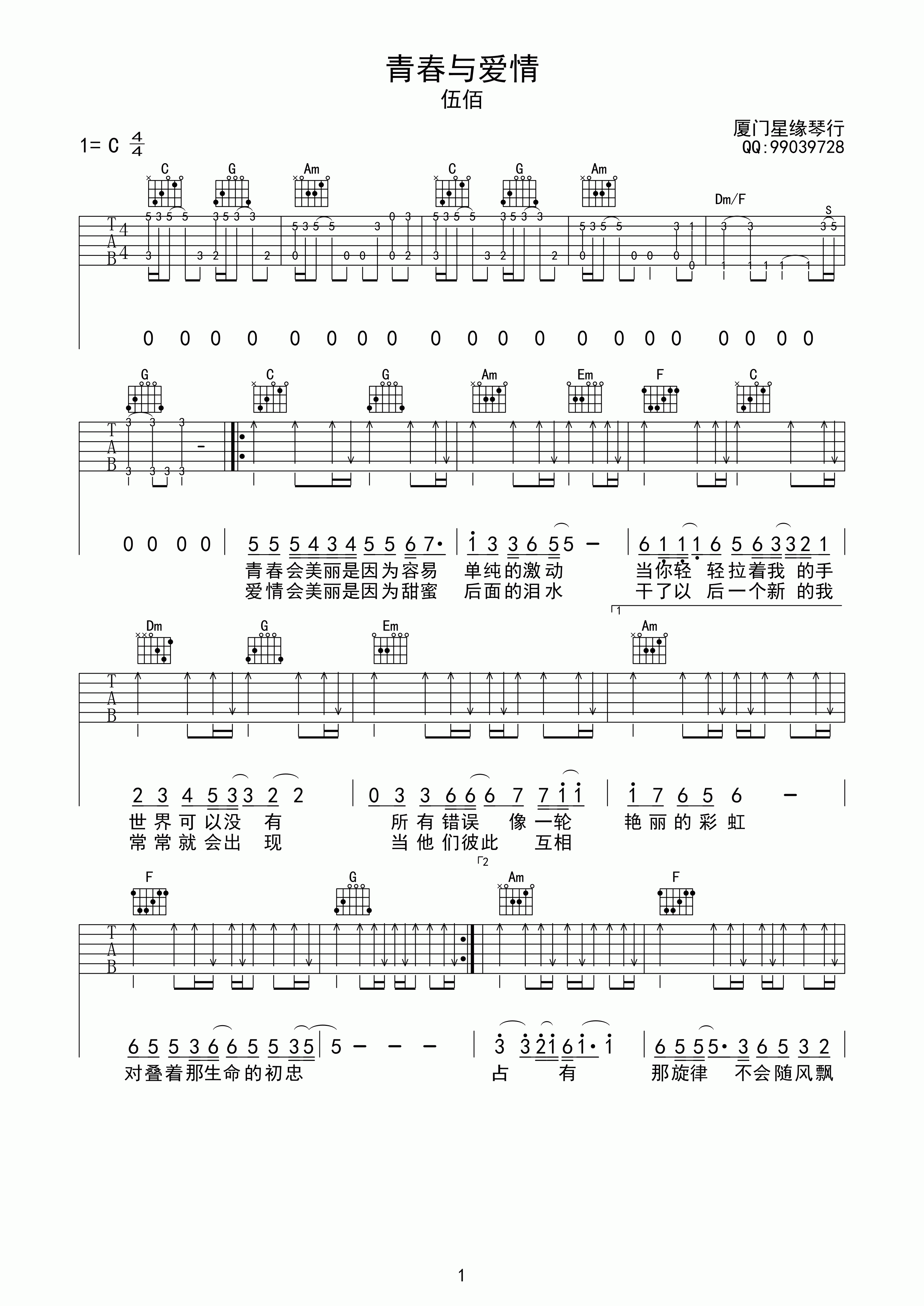 《伍佰《青春与爱情吉他谱》(C调)》内容来自于互联网,不能保证内容的准确性与完整性,仅供学习交流欣赏,请勿用于其它用途,内容版权归原作者及来源网站所有,如有侵犯到您的权益请来信告知,我们将及时删除。