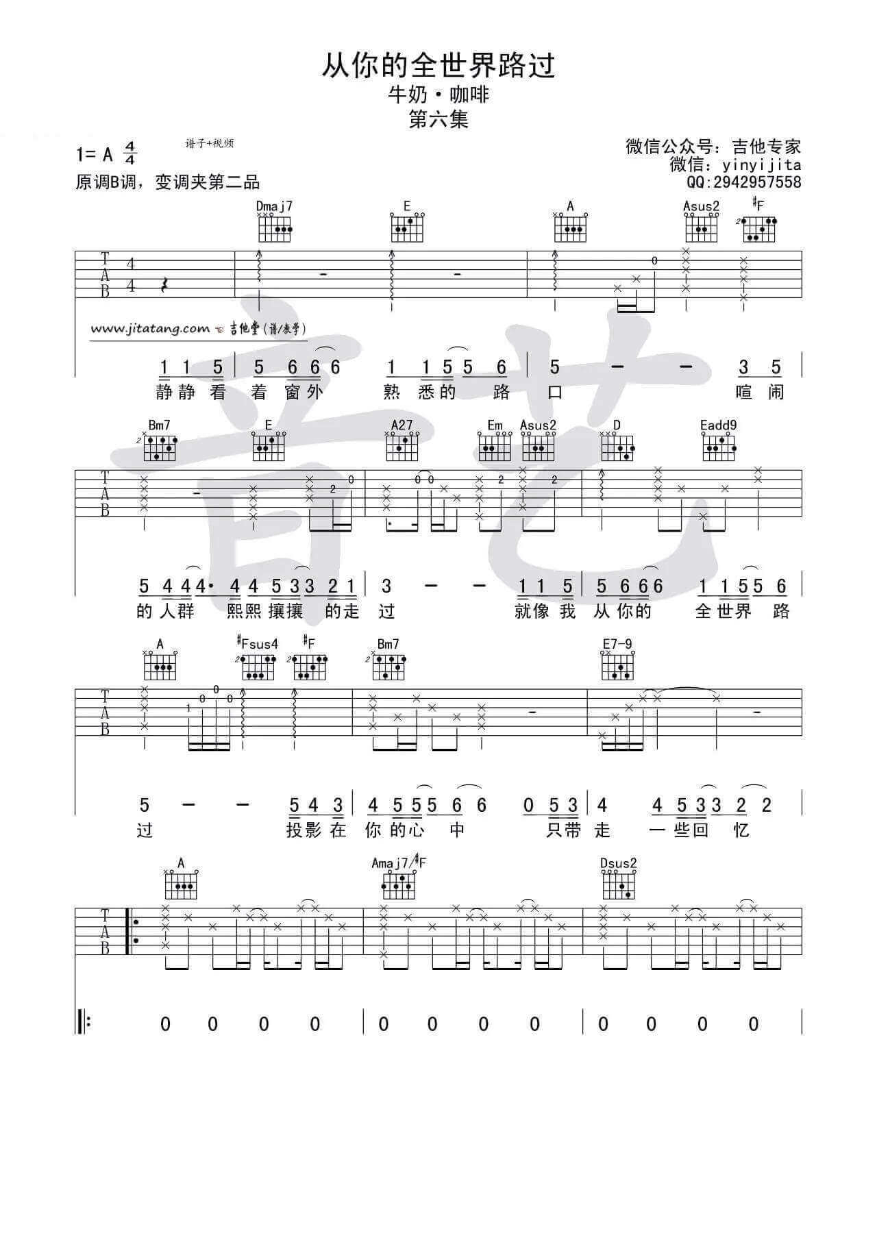 《牛奶咖啡《从你的全世界路过吉他谱》(A调)》内容来自于互联网,不能保证内容的准确性与完整性,仅供学习交流欣赏,请勿用于其它用途,内容版权归原作者及来源网站所有,如有侵犯到您的权益请来信告知,我们将及时删除。
