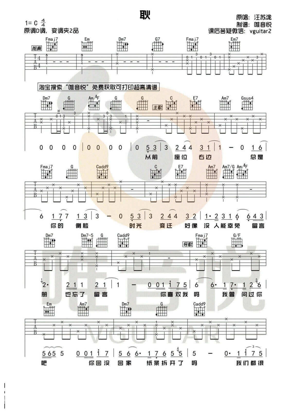 《汪苏泷《耿吉他谱》(C调)》内容来自于互联网,不能保证内容的准确性与完整性,仅供学习交流欣赏,请勿用于其它用途,内容版权归原作者及来源网站所有,如有侵犯到您的权益请来信告知,我们将及时删除。