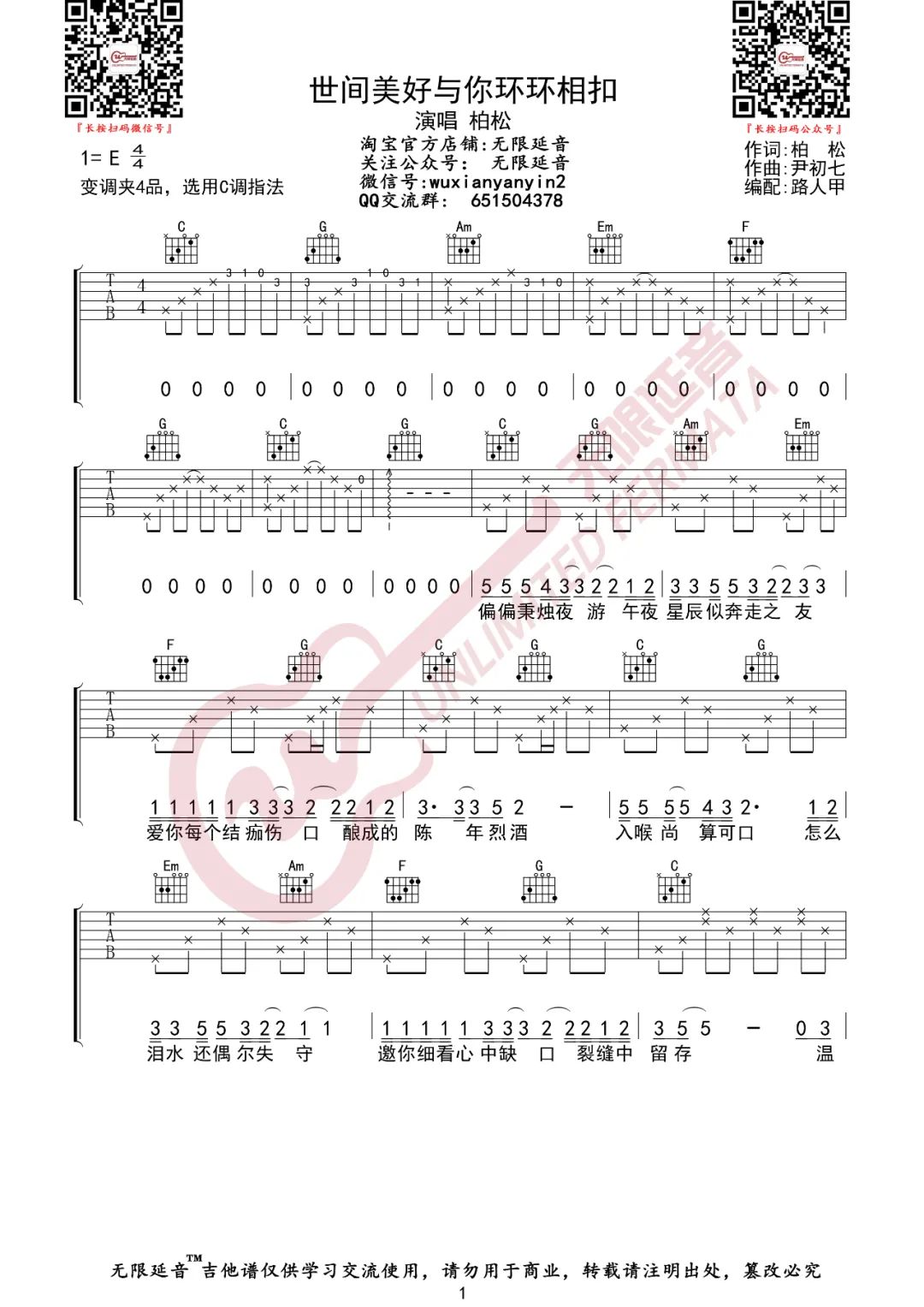 《柏松《世间美好与你环环相扣吉他谱》(C调)》内容来自于互联网,不能保证内容的准确性与完整性,仅供学习交流欣赏,请勿用于其它用途,内容版权归原作者及来源网站所有,如有侵犯到您的权益请来信告知,我们将及时删除。