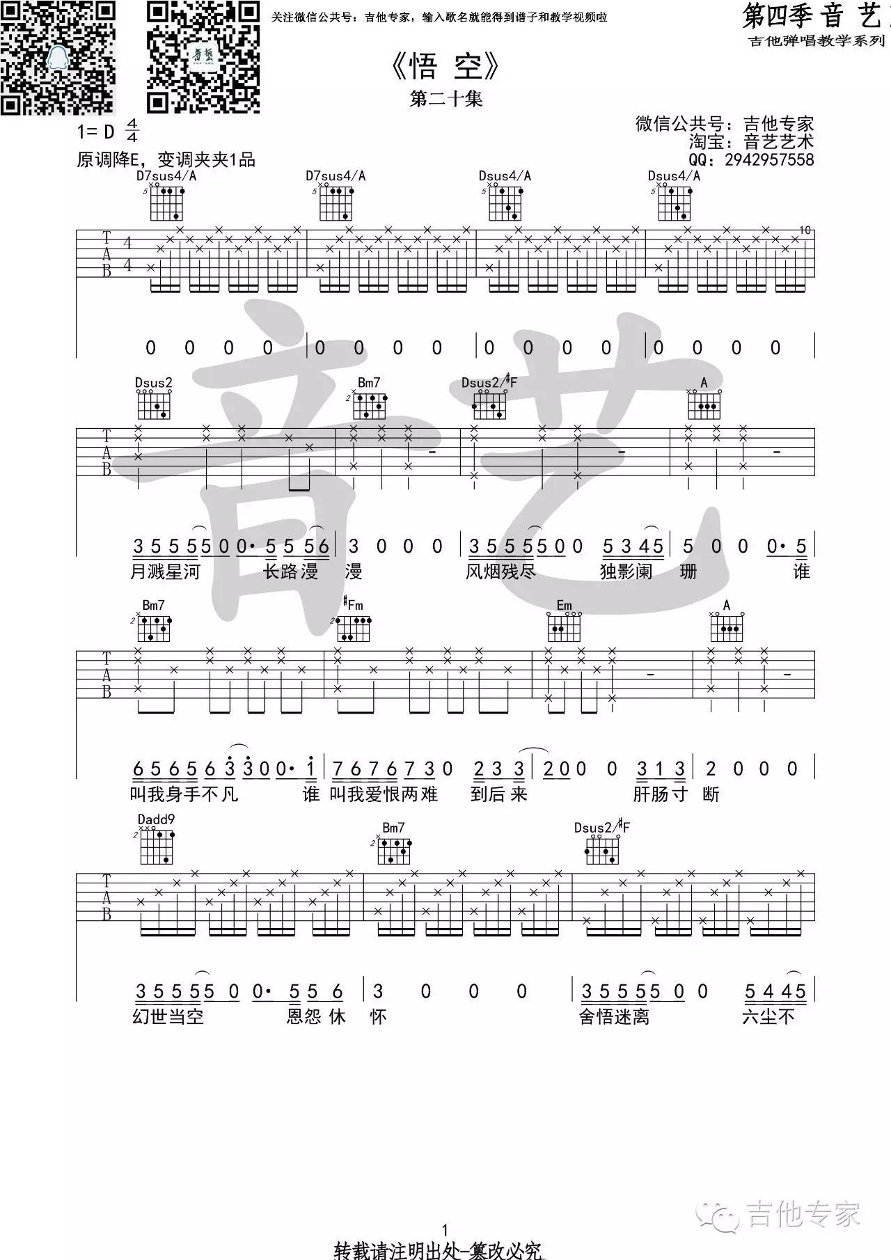 《戴荃《悟空吉他谱》(D调)》内容来自于互联网,不能保证内容的准确性与完整性,仅供学习交流欣赏,请勿用于其它用途,内容版权归原作者及来源网站所有,如有侵犯到您的权益请来信告知,我们将及时删除。