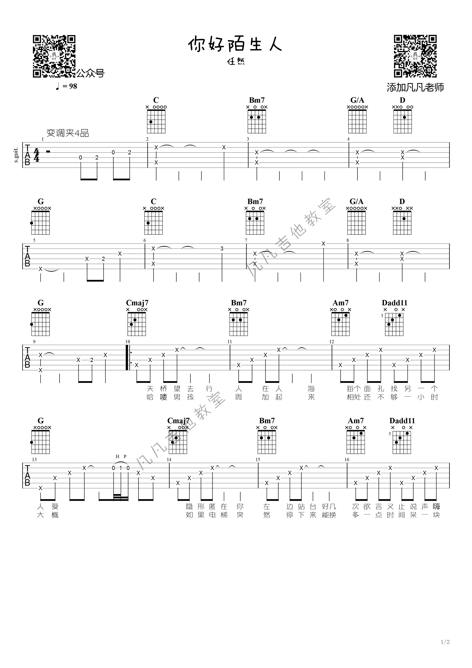 这首治愈歌曲《你好陌生人》以吉他谱和六线谱呈现,由凡凡吉他教室制作。整体简单易上手,前奏保留了原曲风格,让人感到温馨宜人。歌曲以五个和弦为主,唱部分循环演奏,让弹唱者轻松入门。其中,G和弦的击勾弦可能是难点,建议通过反复练习食指的击勾弦来提高技巧。配有弹唱演示