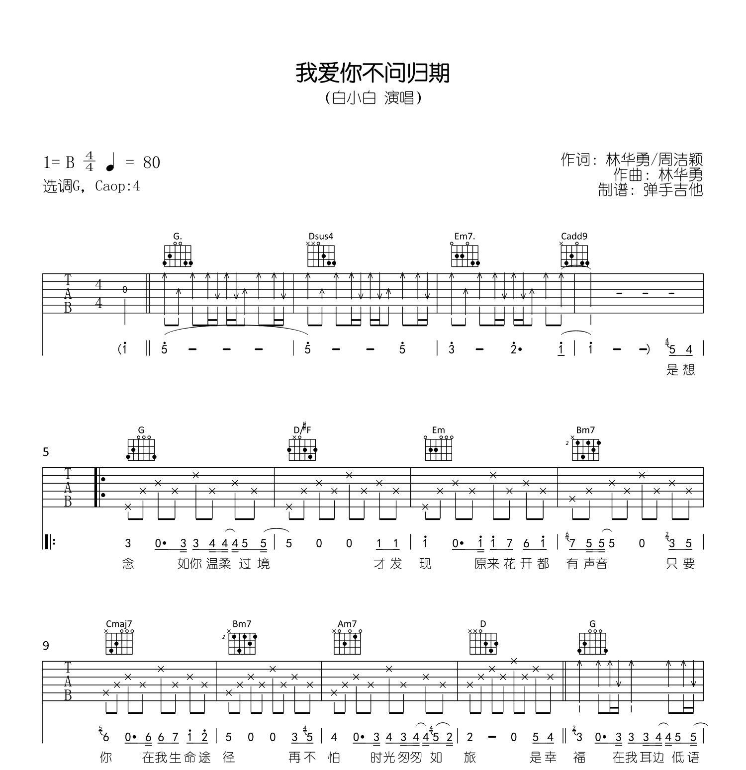 《白小白《我爱你不问归期吉他谱》(G调)》内容来自于互联网,不能保证内容的准确性与完整性,仅供学习交流欣赏,请勿用于其它用途,内容版权归原作者及来源网站所有,如有侵犯到您的权益请来信告知,我们将及时删除。