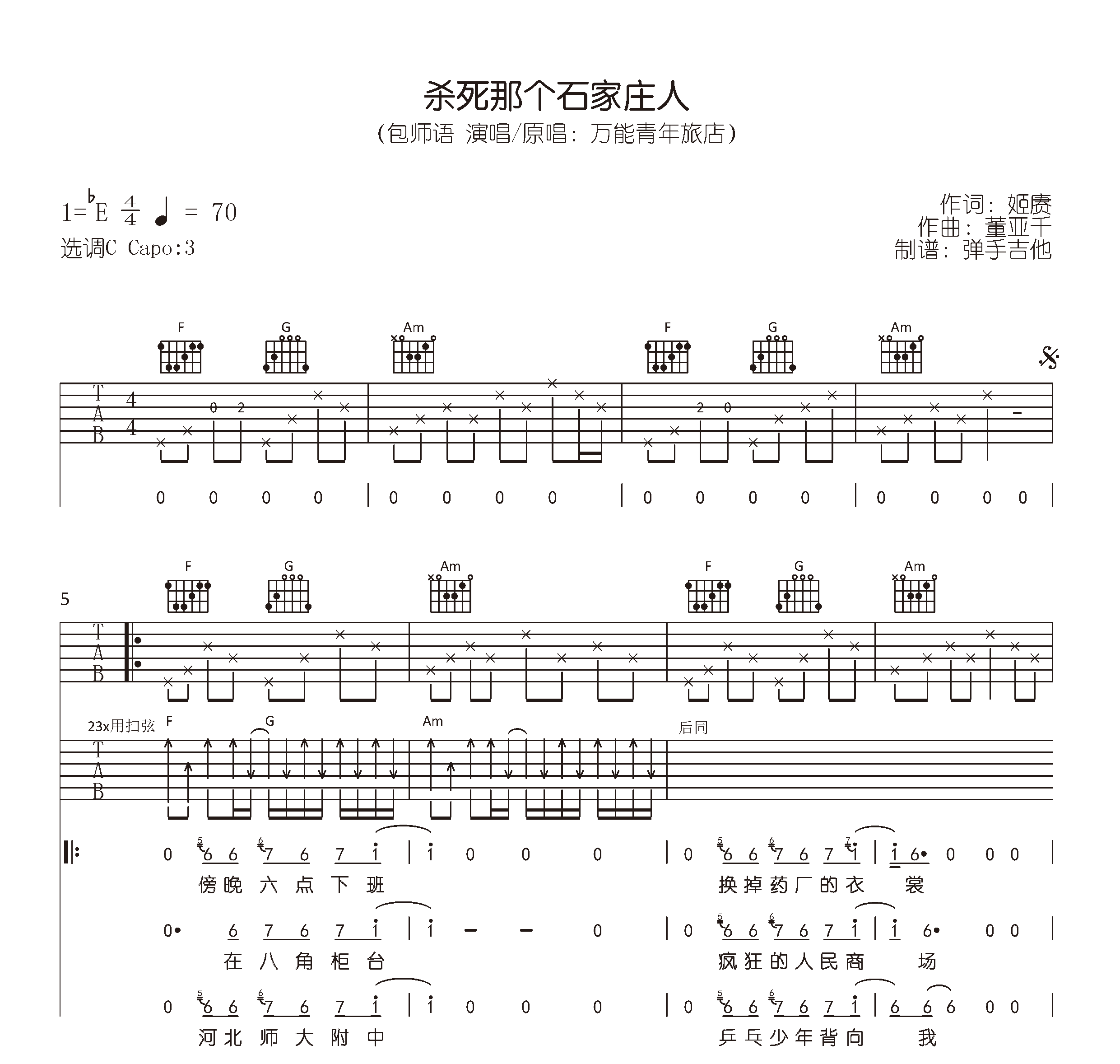 《杀死那个石家庄人》吉他谱以万青演绎,是其经典代表作。歌曲原调降E,采用C调指法,变调夹夹三品。谱中详细编配,共三张高清图片,由包师语演绎,为这首经典之作注入了独特的情感。整理更新的谱表呈现了清晰的演奏指导,带领吉他爱好者探索这首深情而富有力量的音乐之旅。