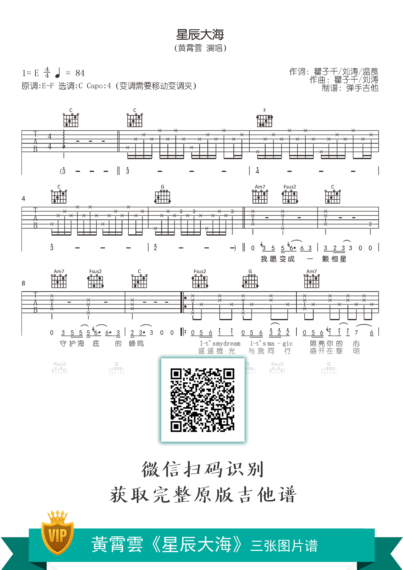 《黄霄云《星辰大海吉他谱》(C调)》内容来自于互联网,不能保证内容的准确性与完整性,仅供学习交流欣赏,请勿用于其它用途,内容版权归原作者及来源网站所有,如有侵犯到您的权益请来信告知,我们将及时删除。
